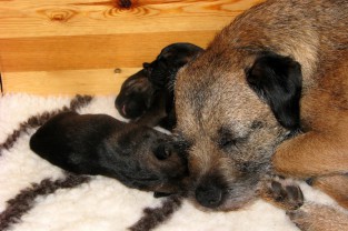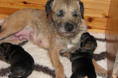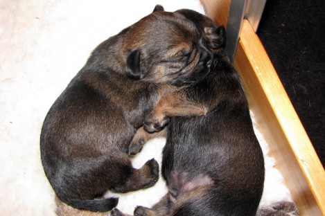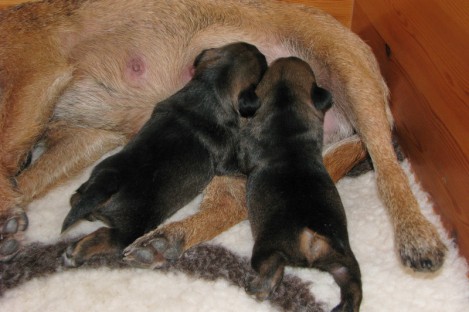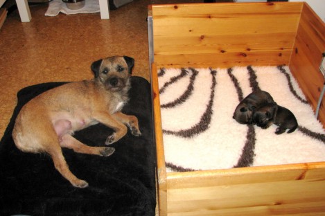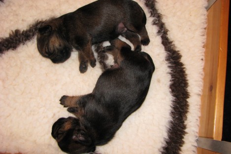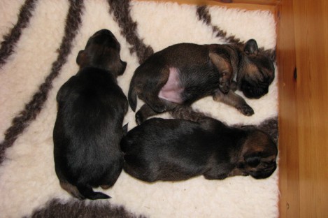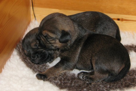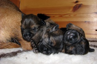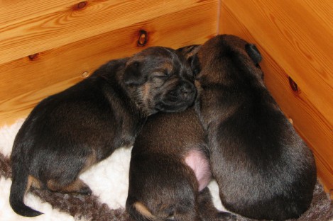 Natuurlijk hebben we de pups ook al namen gegeven. We hebben gezocht naar whisky merken, maar er waren eigenlijk geen geschikte. Daarom zijn we overgestapt naar Ierse en Schotse plaatsnamen. De reutjes heten Kilkenny en Kildavin (Ierse plaatsen, Kil = kerk) en het teefje heet Kintra (Schotse plaats, trouwens ook een whisky merk).