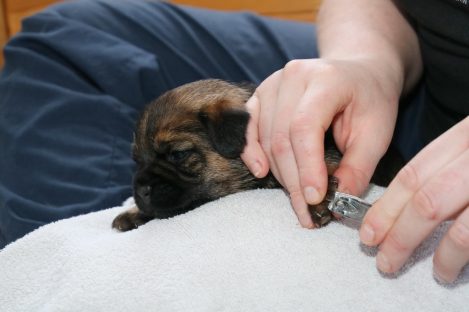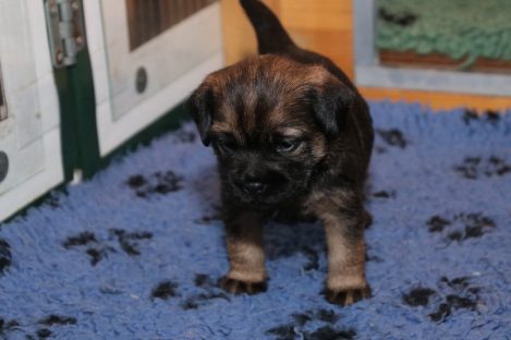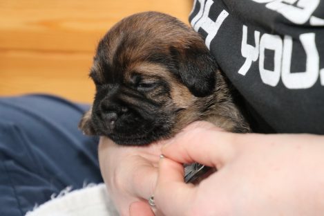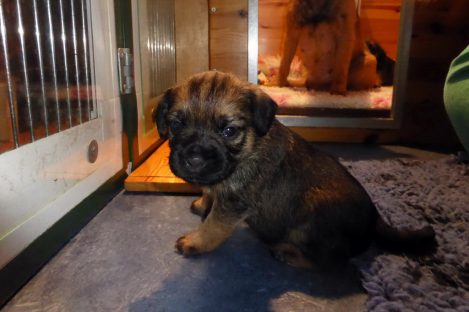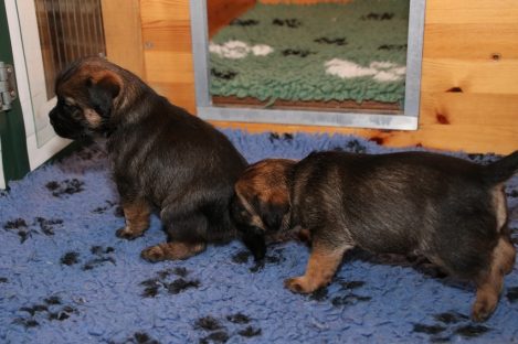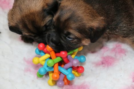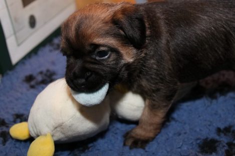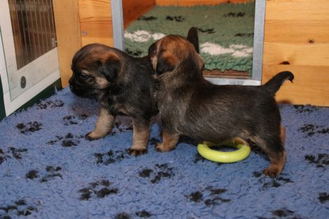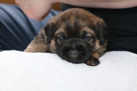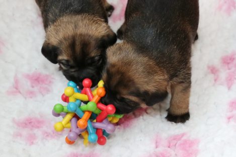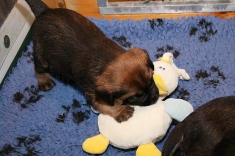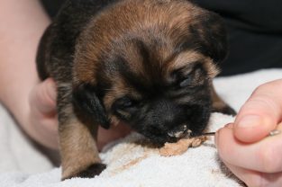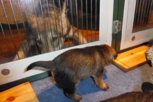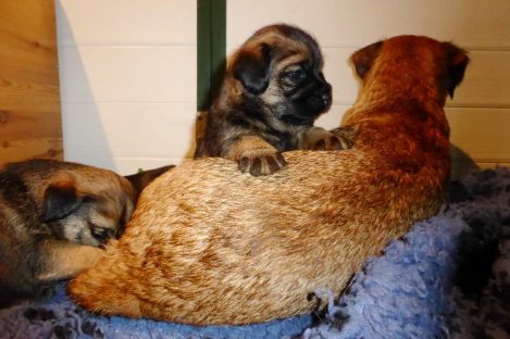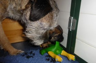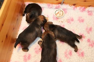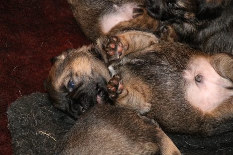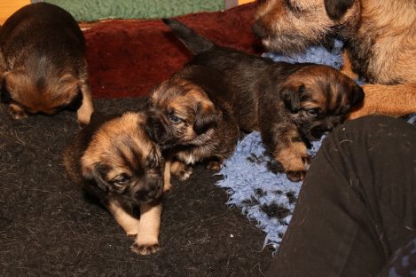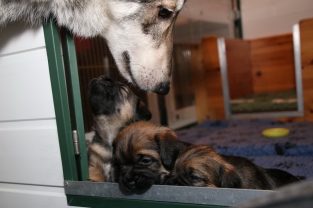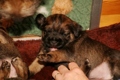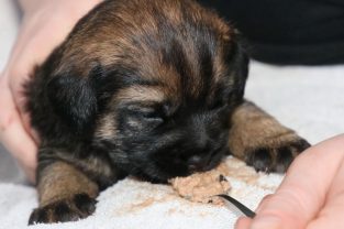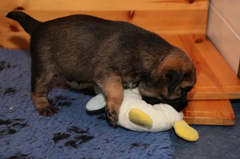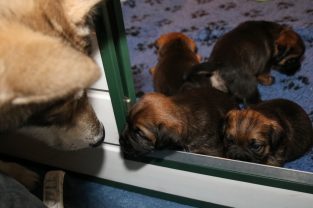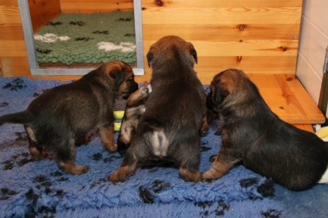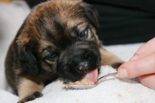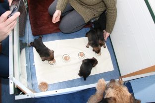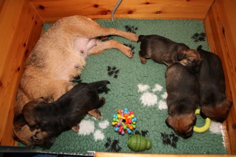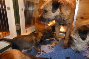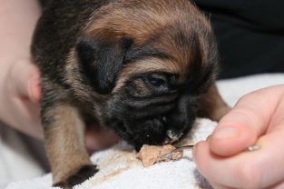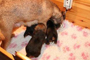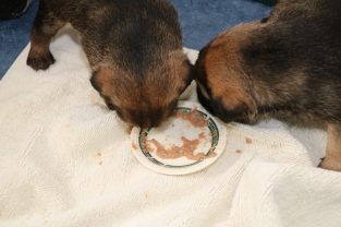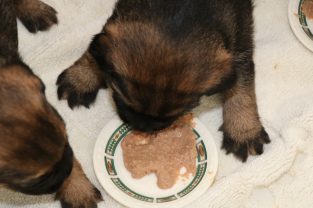 De pups groeien hard en hebben binnenkort niet meer genoeg aan de melk die Jane kan produceren. Het is tijd om ze aan vaster voer te gaan wennen. We zijn daarom begonnen met het voeren van puppy mousse. De eerste keer hebben we ze de mousse van een lepeltje laten proeven. Ze vonden het gelukkig allemaal best lekker. De dag erna hebben we ze de mousse op een schoteltje gegeven. Ze moeten het dan zelf oplikken, wat ze ook prima deden. Dat was dolle pret, alles zat onder de mousse. Gelukkig vond Jane het deze keer helemaal niet erg om alles schoon te maken.