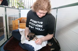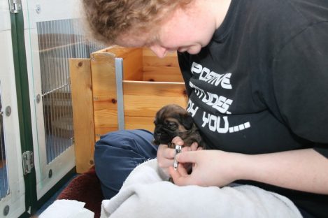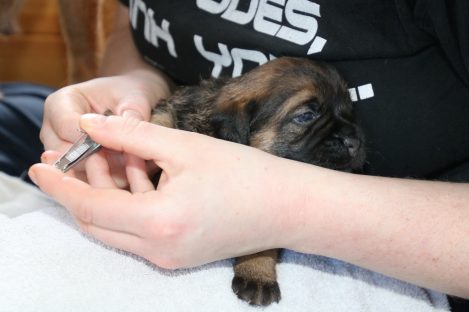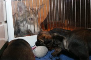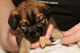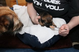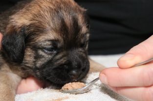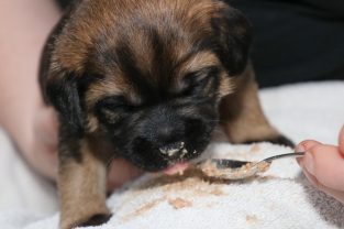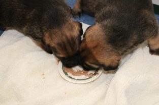 De derde dag hebben we ze twee keer mousse gevoerd, telkens een heel klein beetje meer. De pups eten steeds netter en het wordt niet meer zo’n hele grote kliederboel. En ze helpen elkaar met het schoonmaken van de schoteltjes.