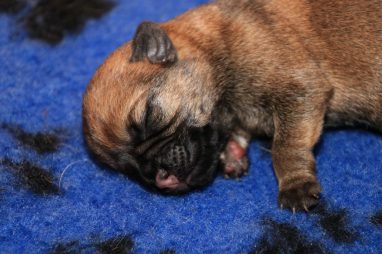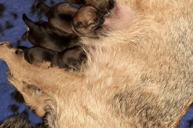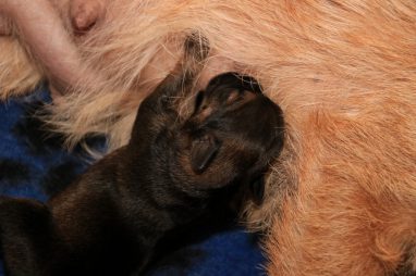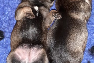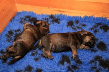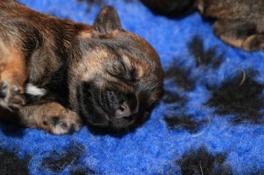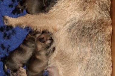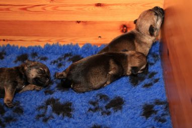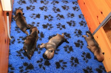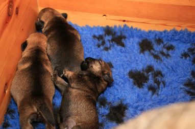 Omdat de pups eigenlijk alleen zogen en veel slapen, is het voor ons nog heel rustig. Wij hoeven alleen af en toe de werpkist schoon te maken en een nieuw kleed erin te doen. Verder kunnen we heerlijk kijken en genieten van die vier wurmpjes.