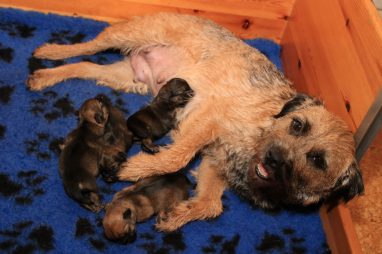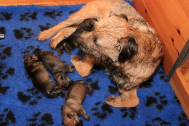 De eerste week zit er al weer bijna op. Jane en haar pups maken het uitstekend. Jane heeft voldoende melk en de pups zijn heel tevreden. Ze slapen, zogen en zijn al behoorlijk beweeglijk. Ze gaan de hele werpkist door, wat moeder Jane niet altijd leuk vindt. Zij wil haar kroost bij zich hebben, zodat ze ze lekker kan poetsen. Want dat doet Jane heel goed, de werpkist blijft heel netjes schoon (en de pups ook). En de pups vinden dat allemaal prima, die zijn heel tevreden en je hoort dan ook nauwelijks geluidjes, behalve tevreden smak-geluiden tijdens het drinken.