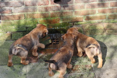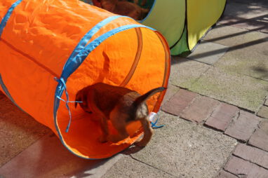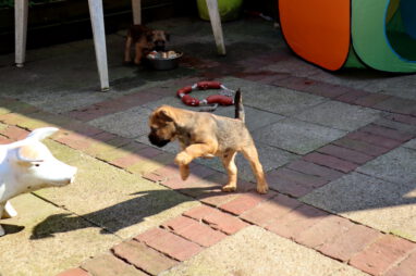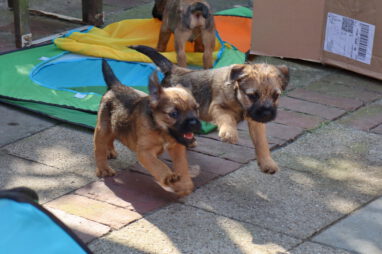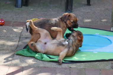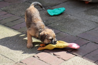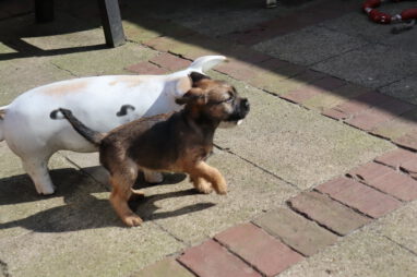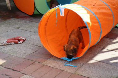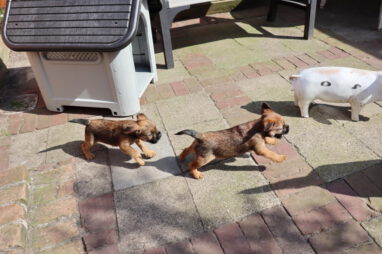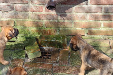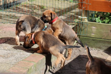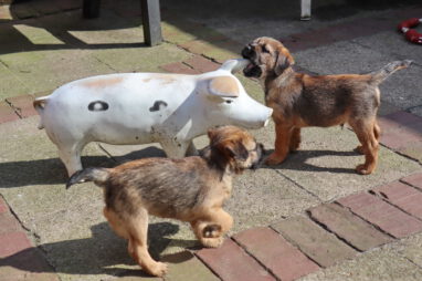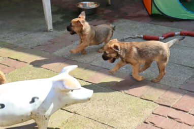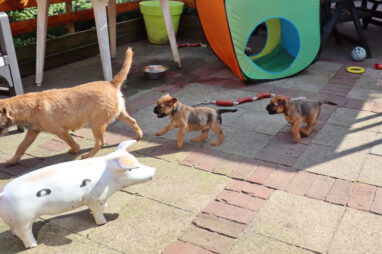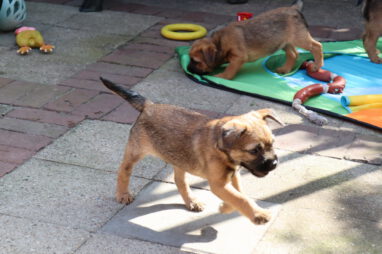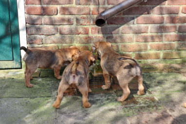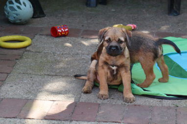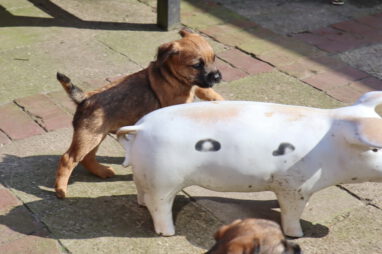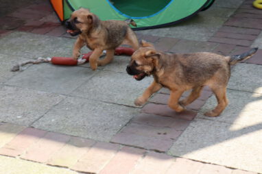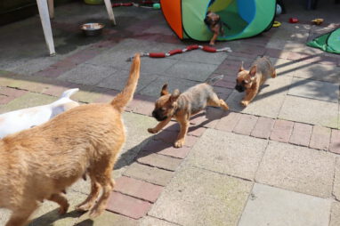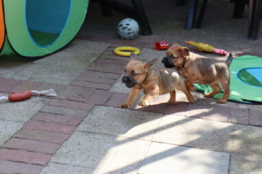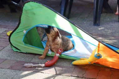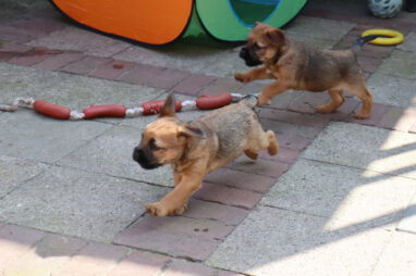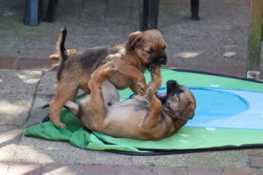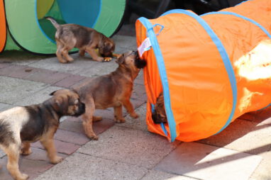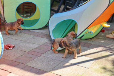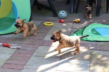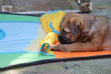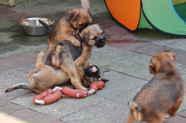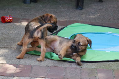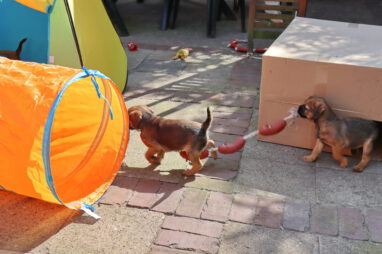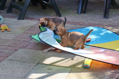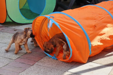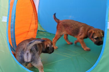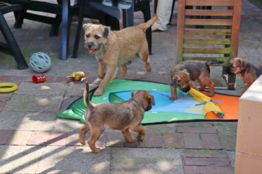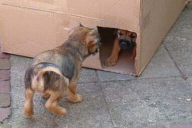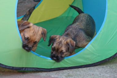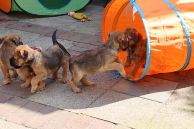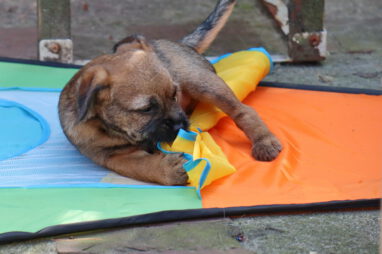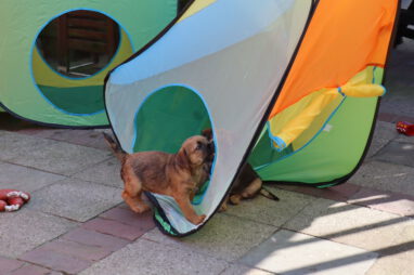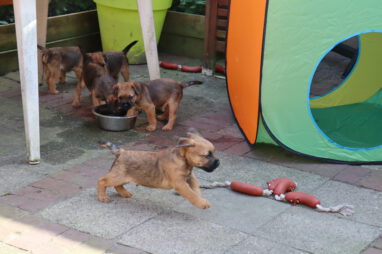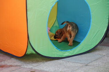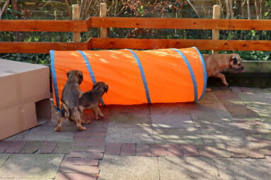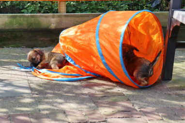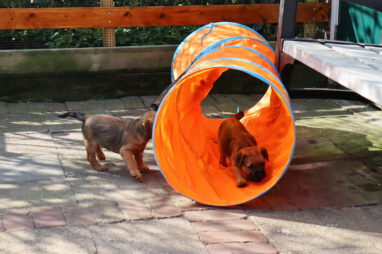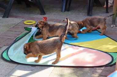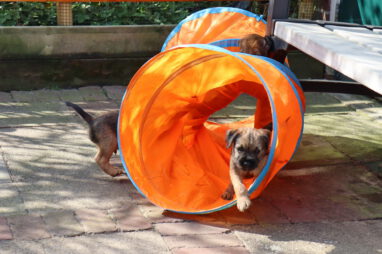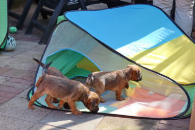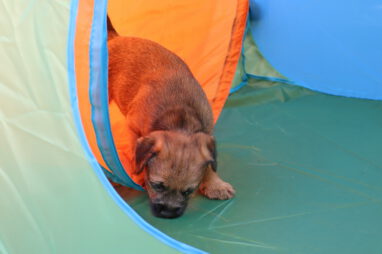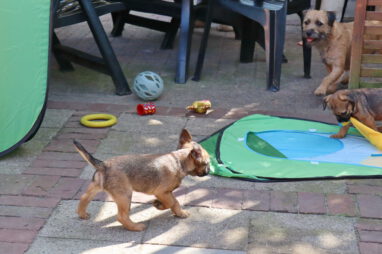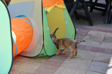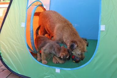 We hebben voor de pups twee tentjes met een tunnel daartussen opgezet. Dat was natuurlijk grote pret. Alles moest onderzocht worden en daarna werd de stevigheid getest. Al gauw lag de tunnel op een heel ander plaats en werd met vereende krachten een tentje ingeklapt. De pups hadden de grootste lol met z’n allen. We hopen niet dat er toekomstige eigenaren zijn die met hun Border willen gaan kamperen. We kunnen niet garanderen hoe lang hun tent dan overeind blijft staan.