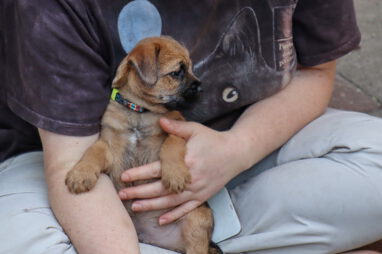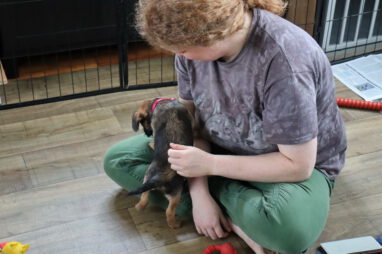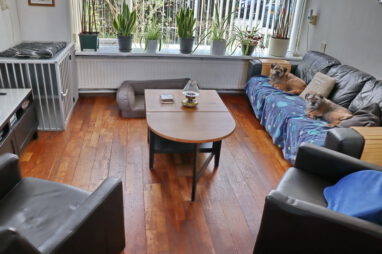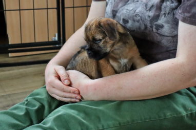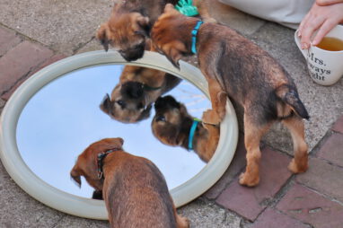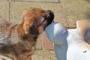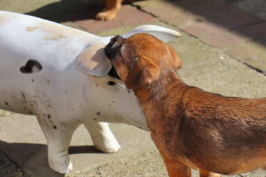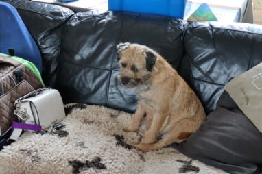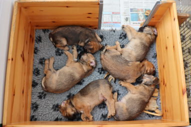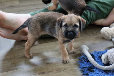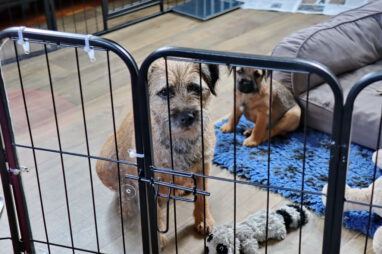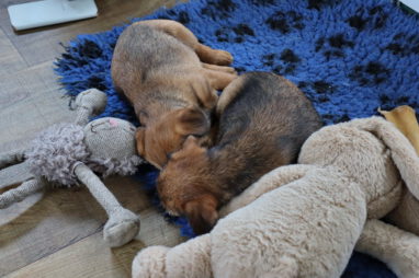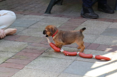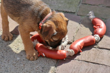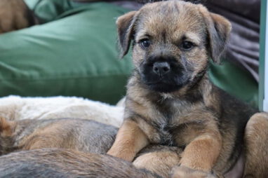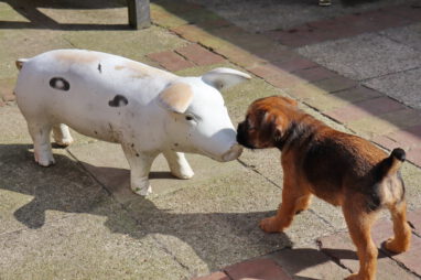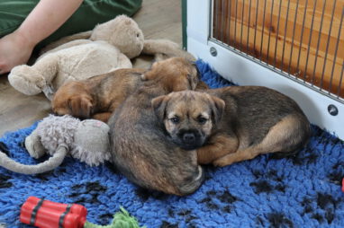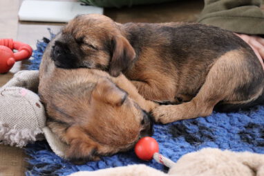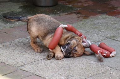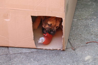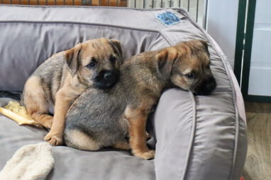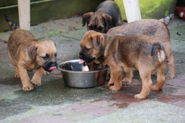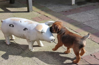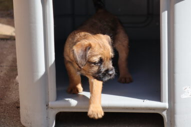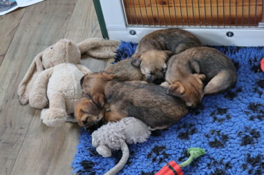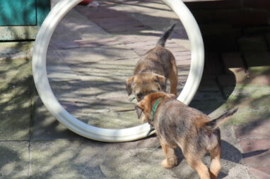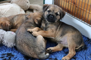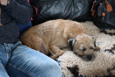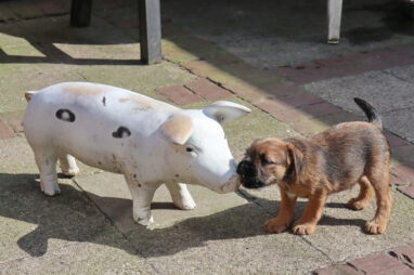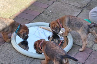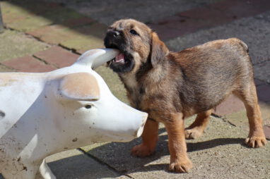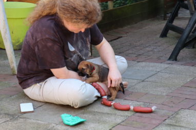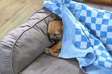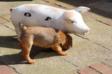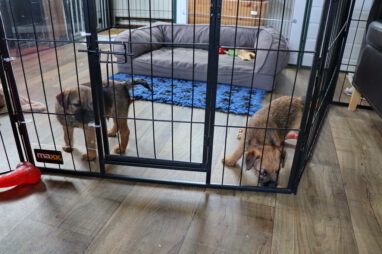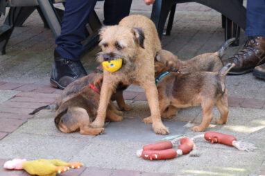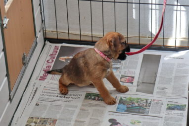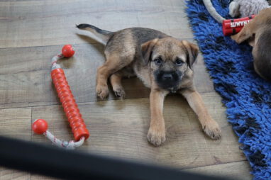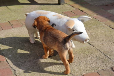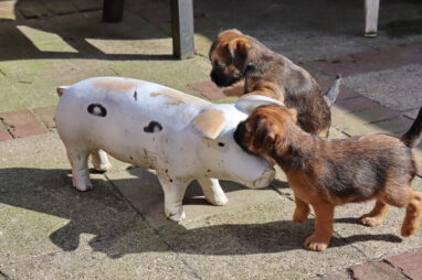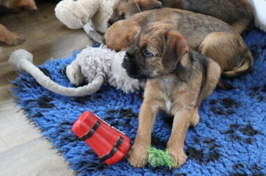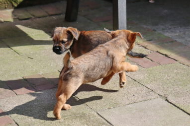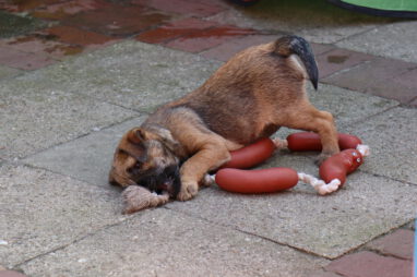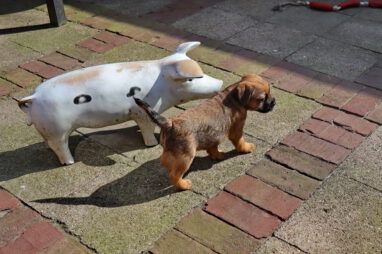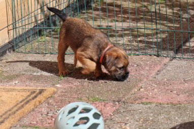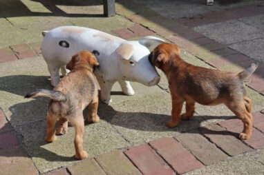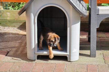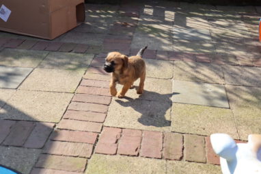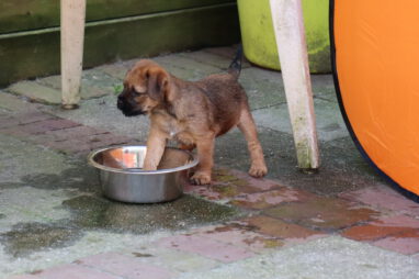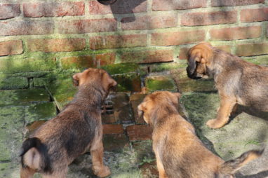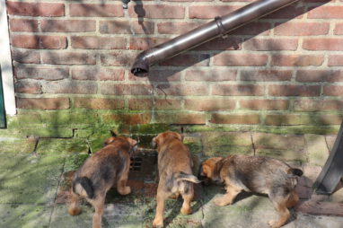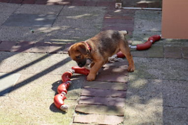 We hebben voor de pups twee tentjes met een tunnel daartussen opgezet. Dat was natuurlijk grote pret. Alles moest onderzocht worden en daarna werd de stevigheid getest. Al gauw lag de tunnel op een heel ander plaats en werd met vereende krachten een tentje ingeklapt. De pups hadden de grootste lol met z’n allen. We hopen niet dat er toekomstige eigenaren zijn die met hun Border willen gaan kamperen. We kunnen niet garanderen hoe lang hun tent dan overeind blijft staan.