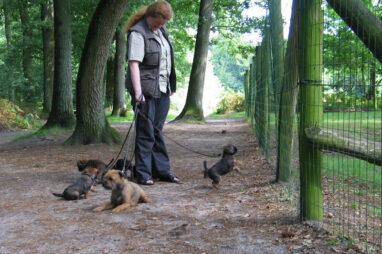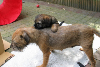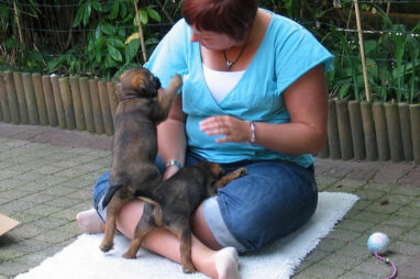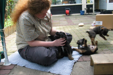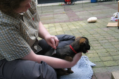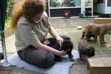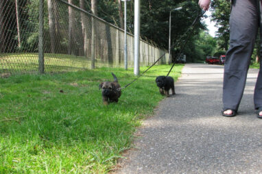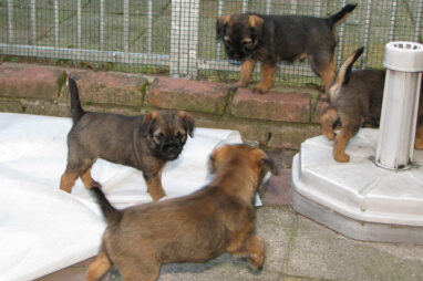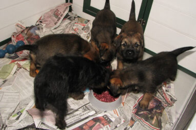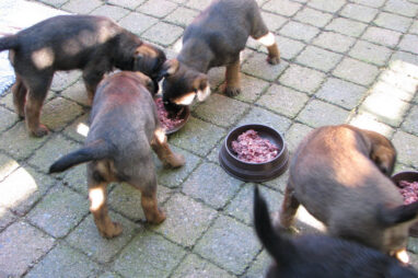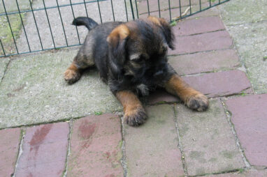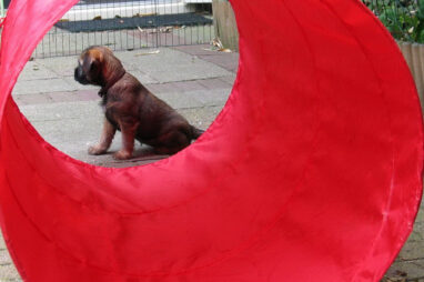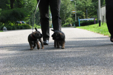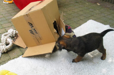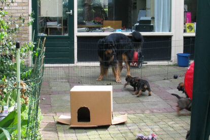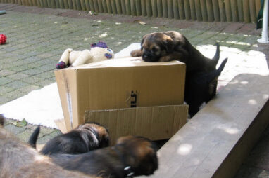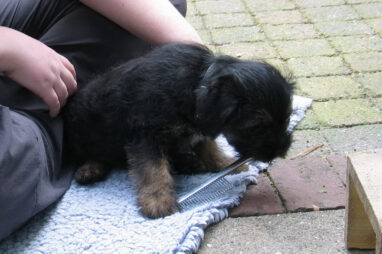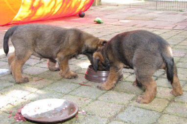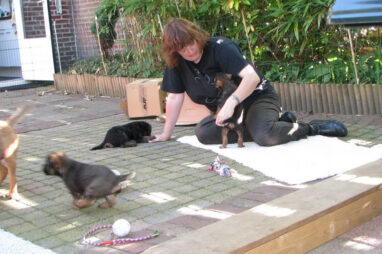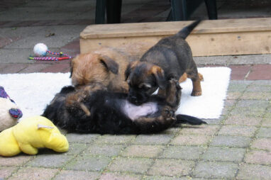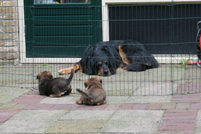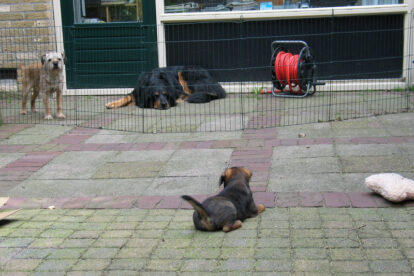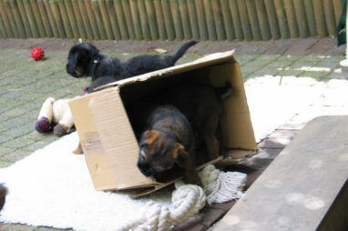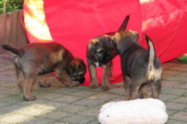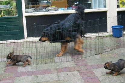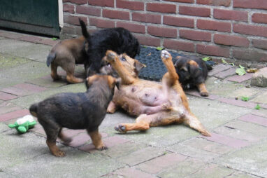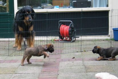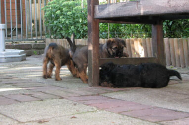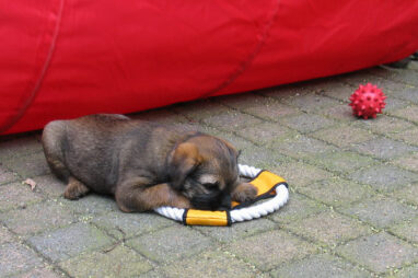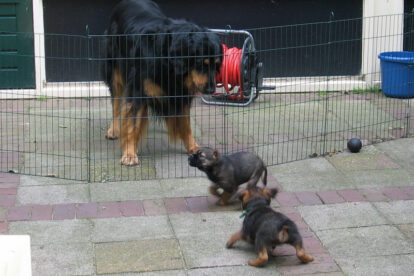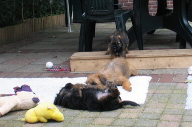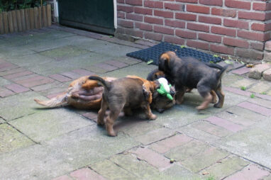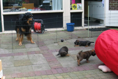Dit is de laatste week dat het hele nest bij elkaar was. Vandaag (zondag) is de eerste pup afgehaald. Hermione is met haar nieuwe baasjes mee gegaan. De vier overgebleven pups vonden het toch wel raar dat er een zusje weg was. Ze waren anders dan anders en hebben na het vertrek eerst heel lang geslapen. Morgen gaat Helios weg en woensdag vertrekken Hermes en Hera. Dan blijft Hestia over, die bij ons blijft. Hoewel het jammer is dat de pups vertrekken zijn we blij dat we nu met de opvoeding van Hestia verder kunnen gaan.