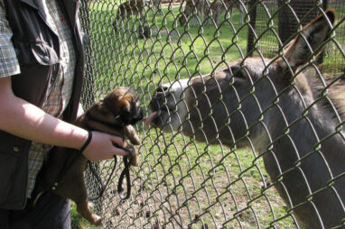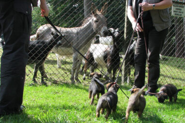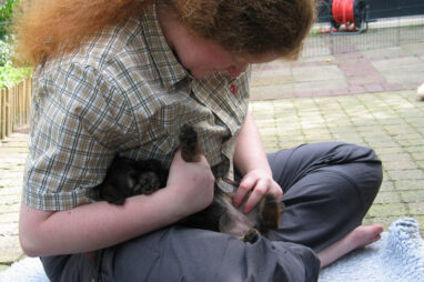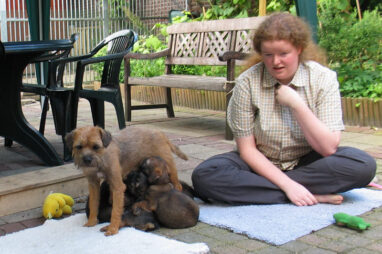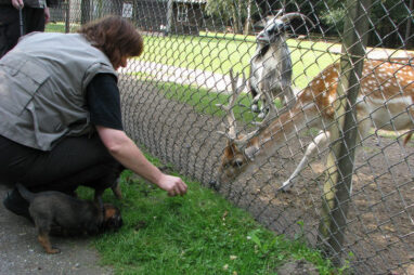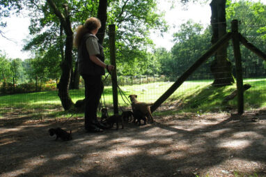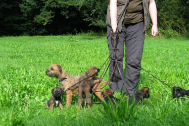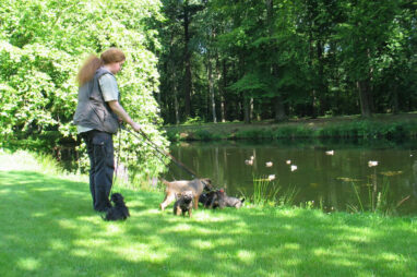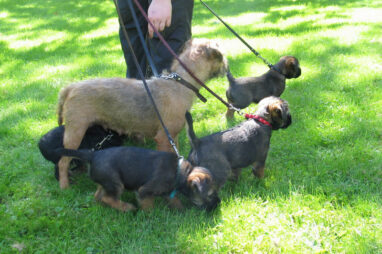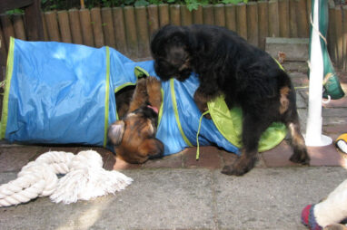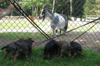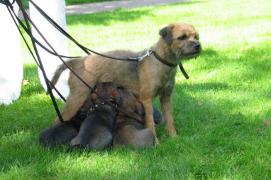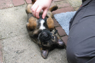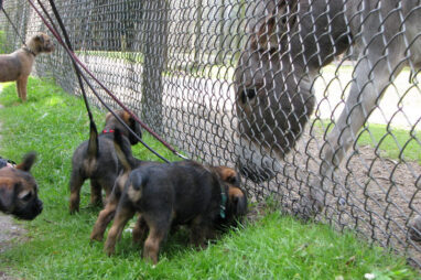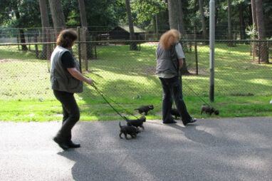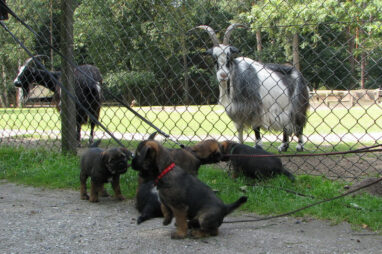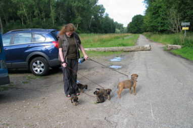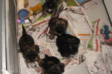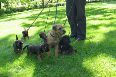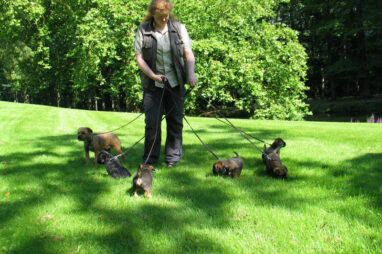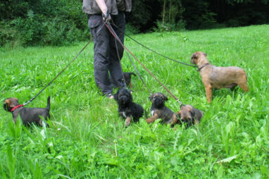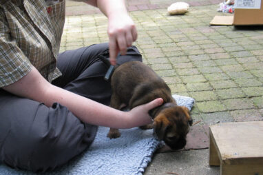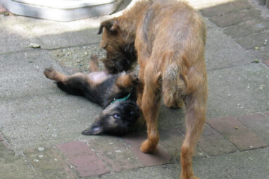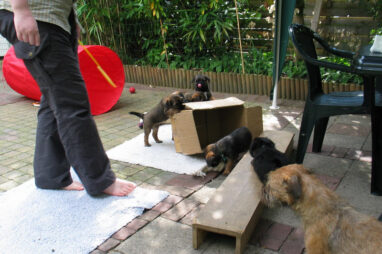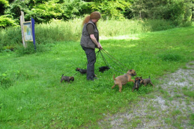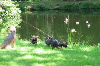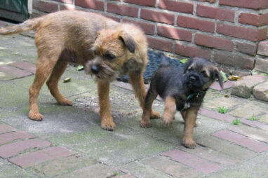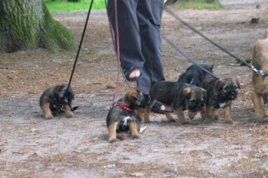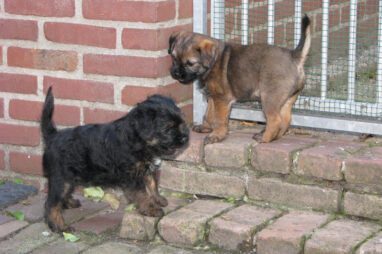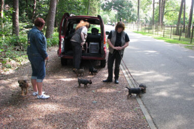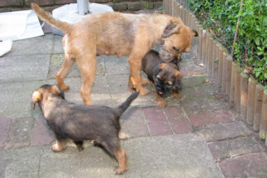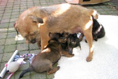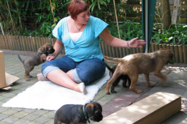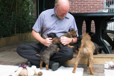 Dit is de laatste week dat het hele nest bij elkaar was. Vandaag (zondag) is de eerste pup afgehaald. Hermione is met haar nieuwe baasjes mee gegaan. De vier overgebleven pups vonden het toch wel raar dat er een zusje weg was. Ze waren anders dan anders en hebben na het vertrek eerst heel lang geslapen. Morgen gaat Helios weg en woensdag vertrekken Hermes en Hera. Dan blijft Hestia over, die bij ons blijft. Hoewel het jammer is dat de pups vertrekken zijn we blij dat we nu met de opvoeding van Hestia verder kunnen gaan.