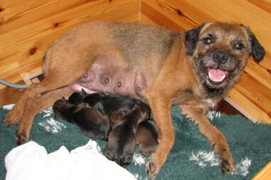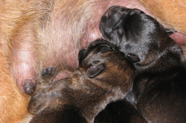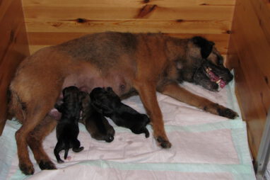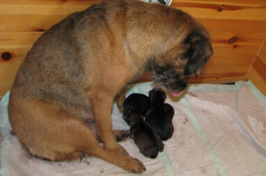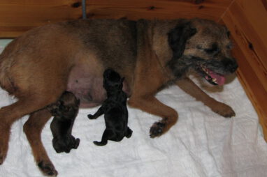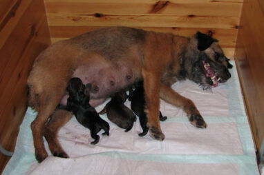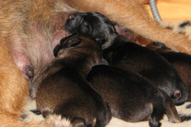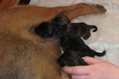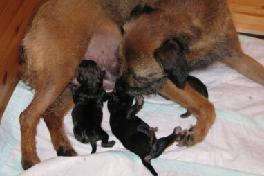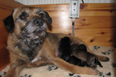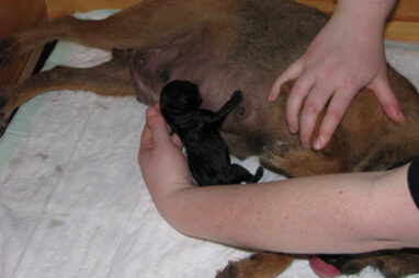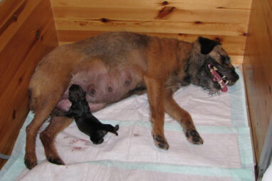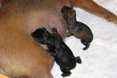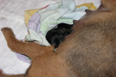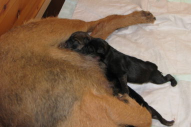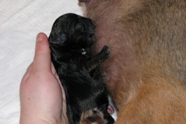 De eerste pup wordt om 8.25 uur geboren, een teefje van 235 gram. Fudge reageert er heel goed op, bijt zelf de navelstreng door en 5 minuten later ligt de pup al heerlijk te drinken. De tweede pup komt om 9.00 uur, een teefje van 170 gram. Ook deze pup drinkt gelijk.