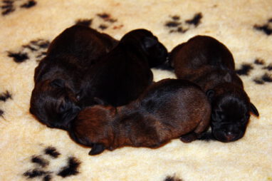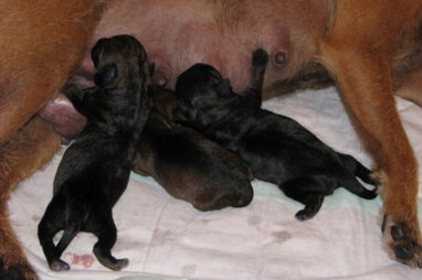 Fudge besluit een pauze te houden. Rond 10 uur krijgt ze weer persweeën en om 10.20 uur wordt een reutje van 220 gram geboren. Nadat de pups weer lekker gedronken hebben gaan ze slapen.