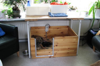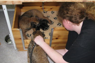 We weten van de röntgenfoto van gisteren dat er vier pups in totaal moeten komen. Het wachten is dus op de laatste. Het duurt lang en zo te voelen zit de laatste pup nog hoog in de buik. Voor de zekerheid gaat Ans met Fudge langs de dierenarts. De pup is inmiddels al wat afgedaald, maar moet binnen 2 uur komen anders wordt het een keizersnee.