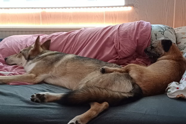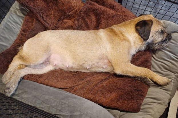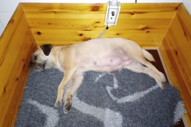 Als Rosie op de bank op haar zij of op haar rug ligt zie je haar buik af en toe bewegen. Ook kan je de pups goed voelen. Maar we kunnen nog niets zeggen over het aantal. Rosie is behoorlijk aangekomen. Een paar dagen geleden hebben we haar gewogen en toen zat ze zo’n 2,5 kilo boven haar normale gewicht!