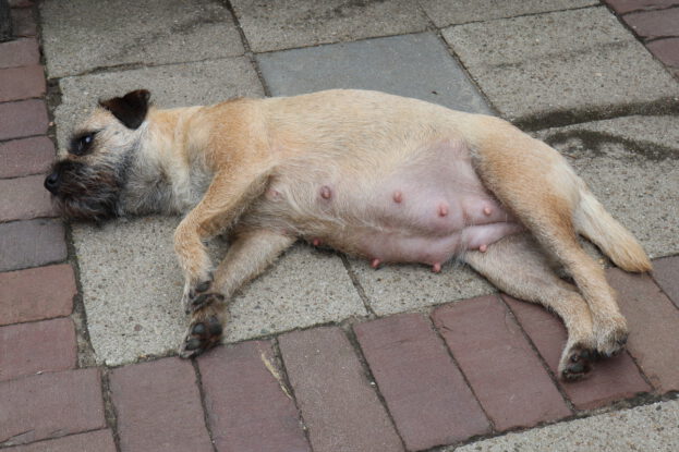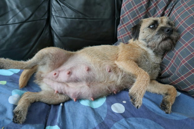 Een week na de dekking begon het gedrag van Rosie al te veranderen. Ze werd steeds rustiger, speelde bijna niet meer en vond alles best zolang zij maar haar rust had. Nu heeft ze af en toe last van ochtendmisselijkheid en eet ze haar voer met lange tanden op. Haar tepels beginnen zich al duidelijk te ontwikkelen. We hebben ook het idee dat ze wat dikker begint te worden en haar middeltje begint te verdwijnen.