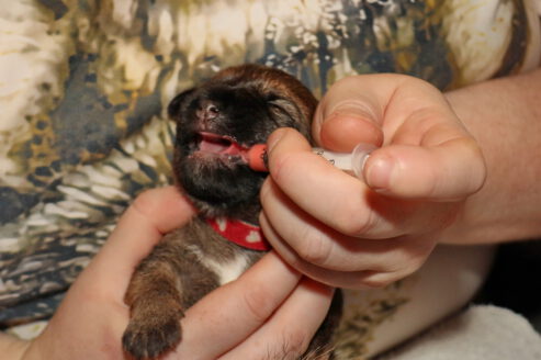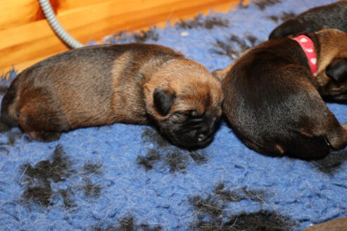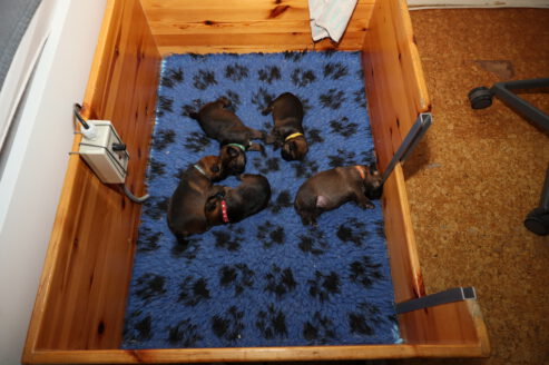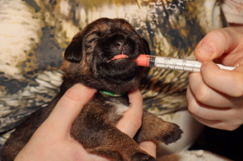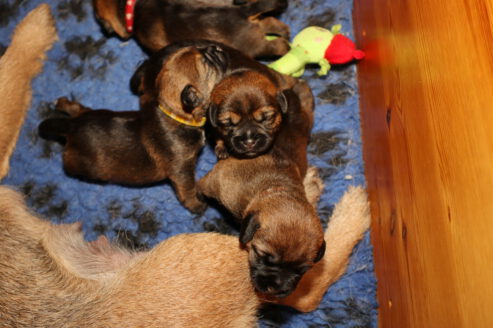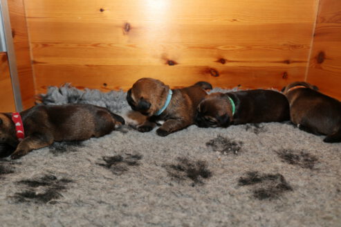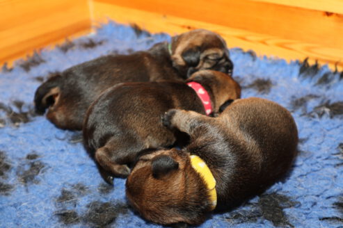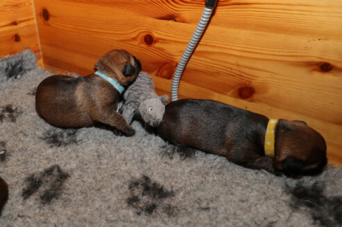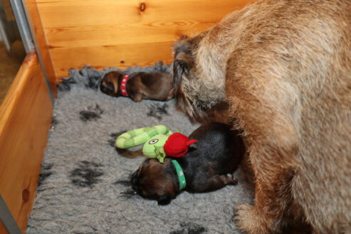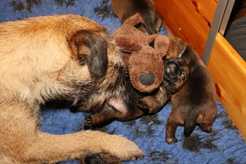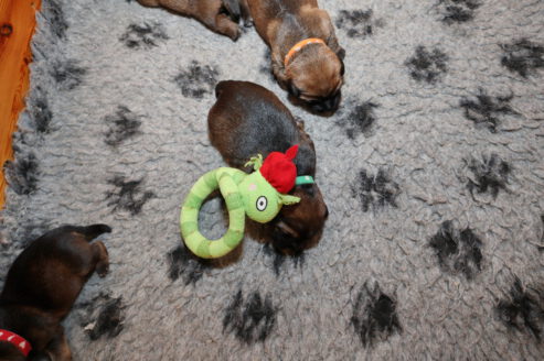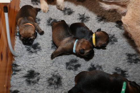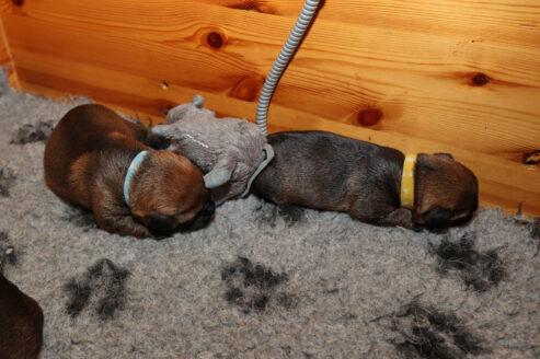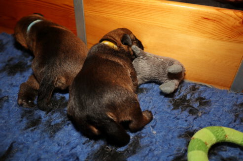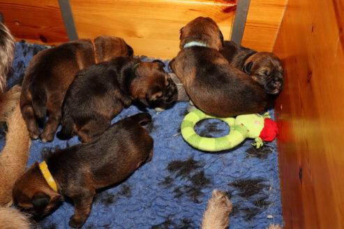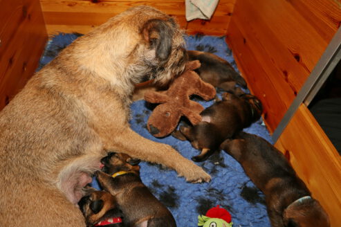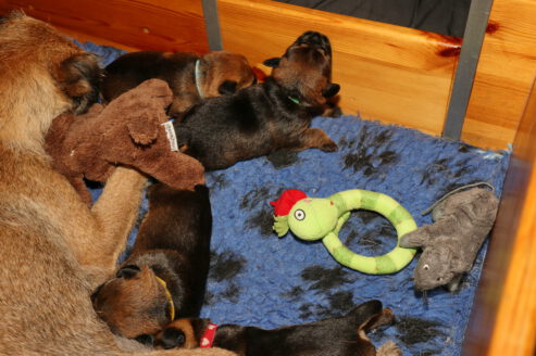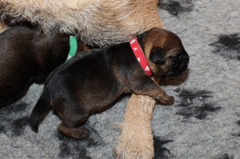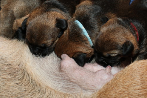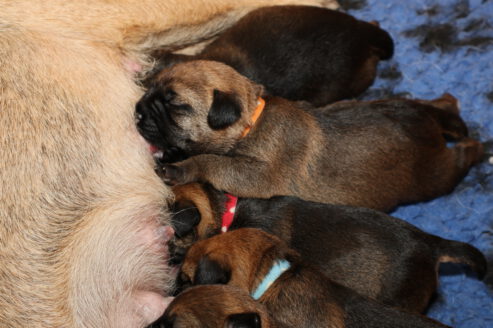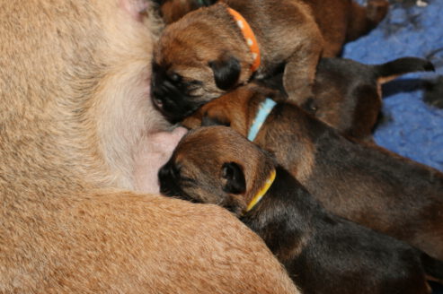 De puppy’s groeien als kool. Ze zijn nu meer dan drie keer hun geboortegewicht. Ze doen dan ook erg hun best bij het drinken. Rosie heef tien werkende tepels, dus de pups hebben het voor het uitzoeken.