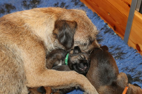Na het zogen verzorgt Rosie alle pups heel goed. En de pups vinden het allemaal prima. Soms blijven er een paar nog lekker nagenieten aan de tepel.