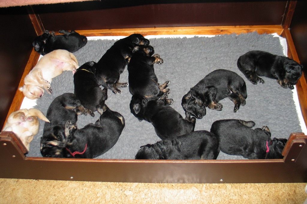 Het was voor ons wel even schrikken, zo dik was Lara niet. Lara was een perfecte moeder, ze had voldoende melk voor allemaal. Wel was het een probleem dat Lara natuurlijk niet voldoende tepels had voor dertien pups. Daarom lieten wij de pups in twee groepen drinken. Bij de ene voeding eerst groep A en daarna groep B, de volgende voeding eerst groep B en daarna groep A. Dit iedere twee uur, dag en nacht.