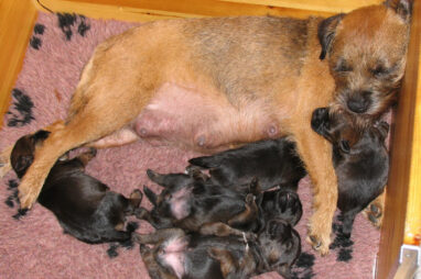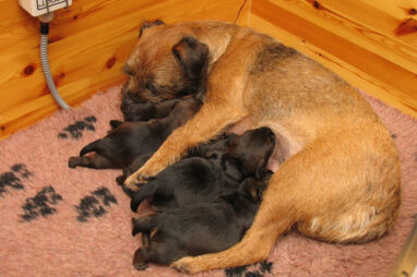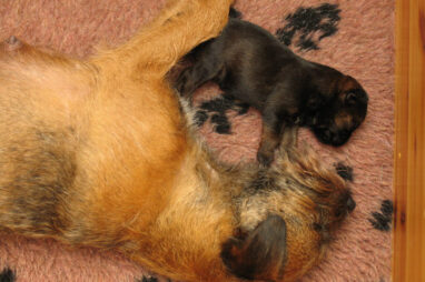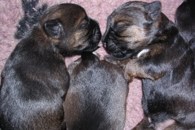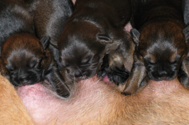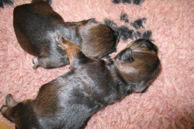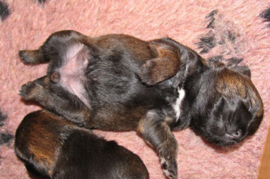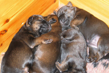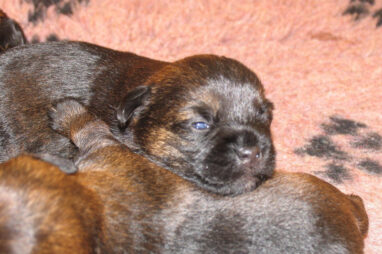 We gaan de tweede week in, wat gaat dat snel! Drie van de vijf pups zijn vandaag verdubbeld in gewicht, dat is best snel. De andere twee volgen waarschijnlijk morgen. Op een paar foto’s kan je goed zien dat de oogspleten duidelijker zichtbaar worden. Het zal niet meer lang duren voordat de eerste zijn ogen open gaat doen.
