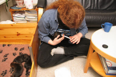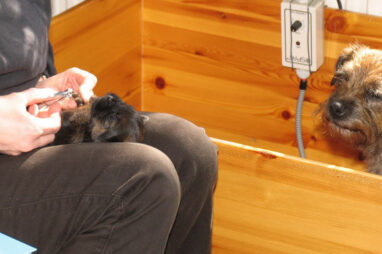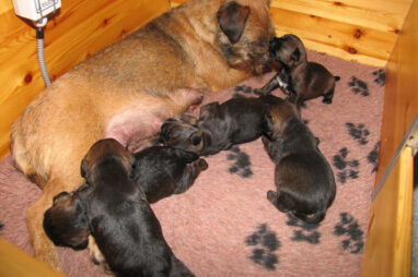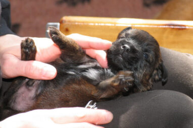Ook nog wat foto’s van de eerste stapjes, onder het toezicht van moeders natuurlijk! Gisteren zeiden we het al, de pups worden duidelijk actiever. Vandaag waren ze erg moeilijk aan de tepel te krijgen. Geen van allen was het eens met de tepel die we ze aanboden. Gemor, geduw, zelfs geluidjes kwamen er aan te pas. Uiteindelijk is het toch gelukt. Ze hebben allemaal goed gedronken en groeien alle vijf zeer goed door.