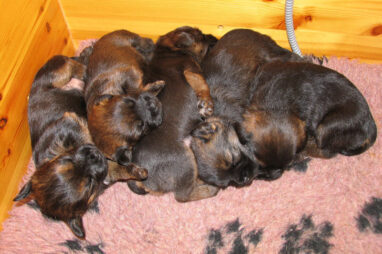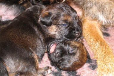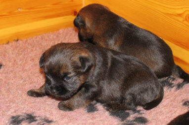 De pups beginnen te ontdekken dat ze niet alleen zijn, maar broertjes en zusjes hebben. Dat is pas interessant! Die kan je omduwen, er overheen kruipen en zelfs in oren en poten bijten. Nou ja, bijten… Ze hebben nog geen tanden (gelukkig) dus dat bijten valt wel mee. Het is prachtig om te zien hoe ze met elkaar om gaan.