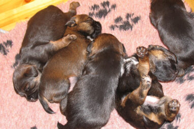 Het worden al echte hondjes. Ze beginnen nu met elkaar te spelen. Ze happen in elkaars poten, staart en oren en maken af en toe al behoorlijk herrie. Heel grappig om te zien en te horen. Soms wordt er eentje wakker en begint fanatiek zijn broers en zussen uit te dagen. Tegen de tijd dat de anderen wakker zijn geworden is hij zelf al zo moe dat hij weer ligt te slapen. Ze houden elkaar goed bezig op deze manier. Daarna zijn ze allemaal uitgeteld en liggen soms in de meest vreemde houdingen te slapen.