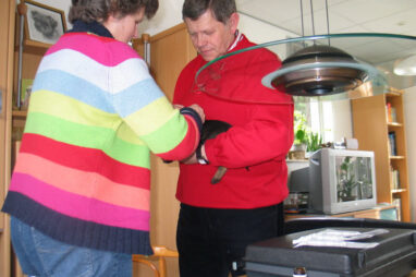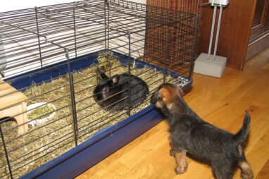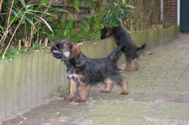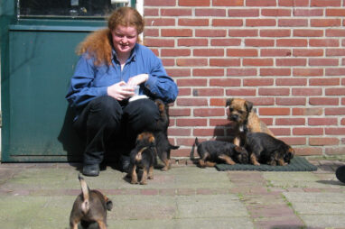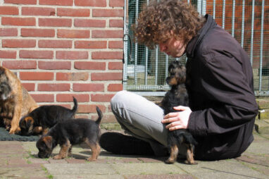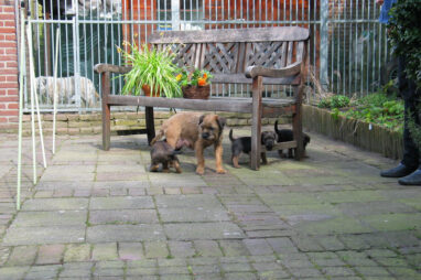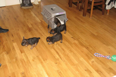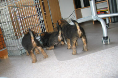De pups zijn vandaag naar de dierenarts geweest voor hun eerste enting. Met z’n vijven in een bench in de auto. Dat ging prima, ze vonden het wel interessant. Bij de dierenarts zijn ze stuk voor stuk onderzocht voordat ze hun enting kregen. Alles is prima in orde. Dan de enting; leuk is het niet maar ze geven nauwelijks een kik, echte terriërs! Terwijl de ene pup bij de dokter op de tafel staat spelen broertjes en zusjes vrolijk rond in de behandelkamer. Angst voor de dierenarts hebben ze in geen geval gekregen!