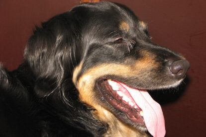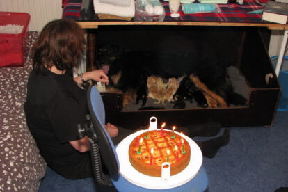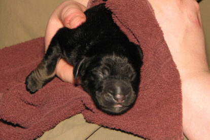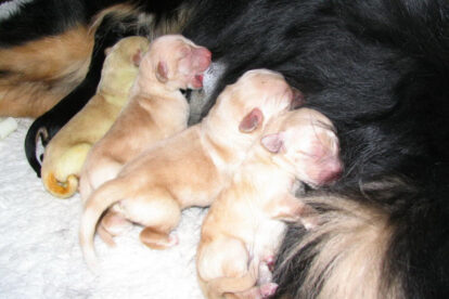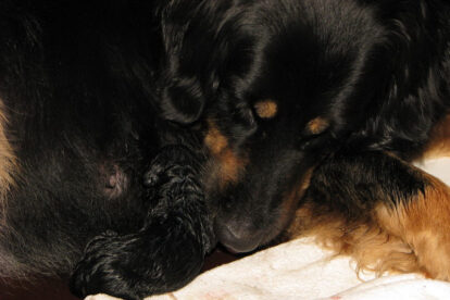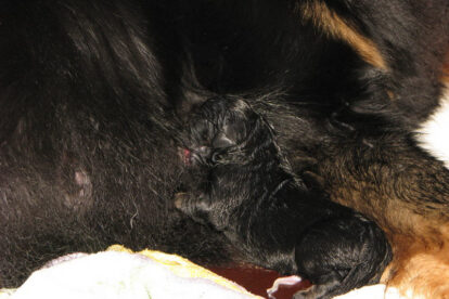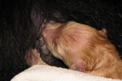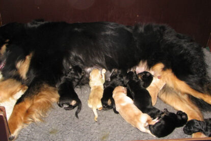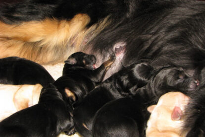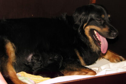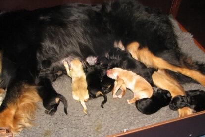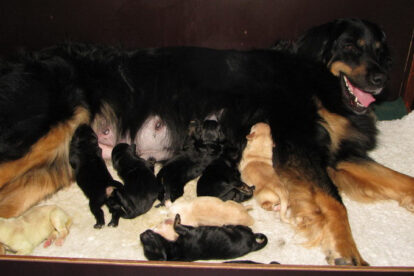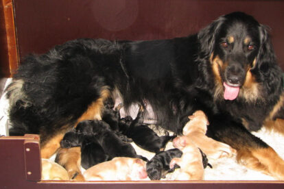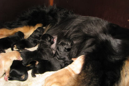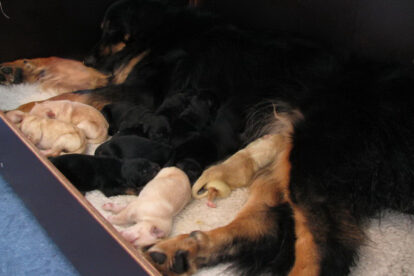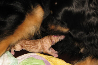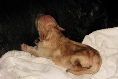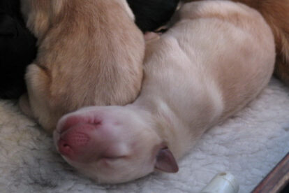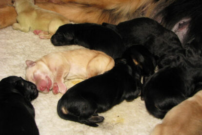 Niets bleek minder waar. Het werd licht en Raya werd rustig. Ze ging weer lekker slapen en heeft de hele maandag geen bijzondere tekenen vertoond. Pas in de avond begon ze weer. Om zes uur kreeg ze een sterke wee, het leek op het begin van de persweeën. Daarna lag ze regelmatig zwaar te hijgen, lag in vreemde houdingen tot ze om een uur of tien echte persweeën begon te krijgen. We hebben haar naar de “kraamkamer” gebracht. Het duurde nog tot tien voor twaalf voor de eerste pup werd geboren: een zwartblond teefje. Zo’n twintig minuten later kwam nummer twee, een zwartblond reutje. Een blond teefje volgt veertig minuten later. Raya ging zeer goed met haar pups om en maakte ze goed schoon.