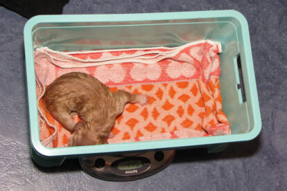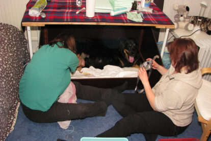 Toen duurde het langer. Raya had nog wel ween, maar er kwam niets. Rond half drie ’s nacht, na telefonisch overleg, naar de Dierenkliniek in Ermelo, compleet met pups. We waren al voorbereid op een keizersnee, maar de dierenarts wist een blonde reu naar buiten te geleiden. Deze jongen had de weg versperd. Weer terug naar huis om op de rest te wachten, want ook volgens de dierenarts zaten er nog zeker drie a vier pups in.