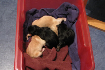 Toen duurde het nog langer. Raya had geen sterke persweeën meer en tot de ochtend kwam er niets meer. De dierenarts had als limiet zeven uur gesteld en toen dat gepasseerd was zonder een merkbare verbetering maar weer met moeder en pups naar de dierenkliniek. Er lag weer een pup in de weg, die er deze maal niet uit te krijgen was. Dan is er nog maar een manier; een keizersnee. Er blijken nog zeven pups in Raya te zitten. Een blonde reu, die helemaal voor in de baarmoeder zat, blijkt te zijn overleden. De overige zes, inclusief de pup die “vast” zat, maken het goed. Zo hebben we een tiental compleet: 2 blonde reuen, 2 blonde teven, 3 zwartblonde reuen en 3 zwartblonde teven.