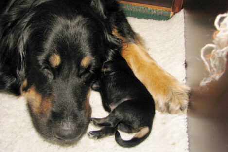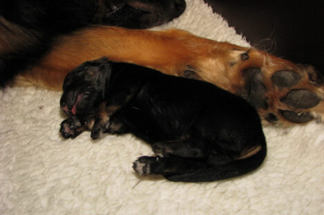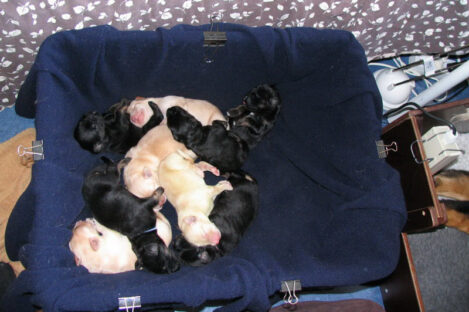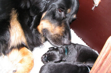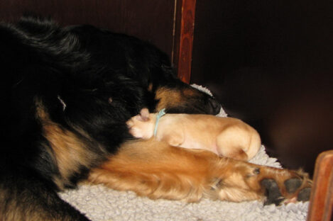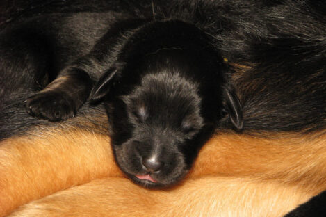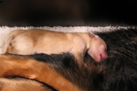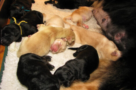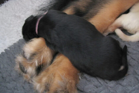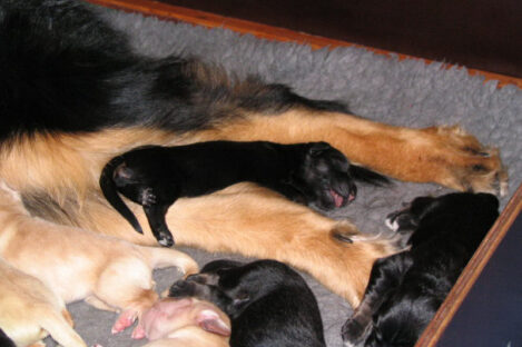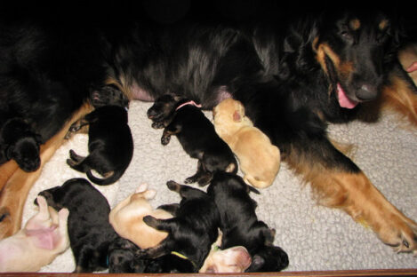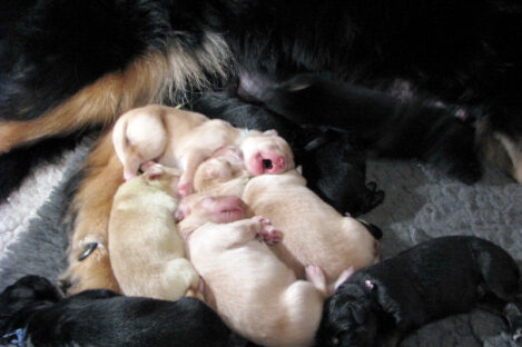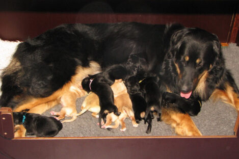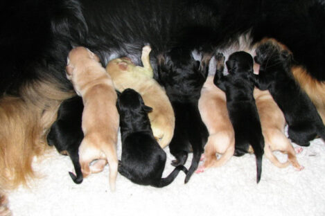 Één dag na de keizersnede is Raya nog wel wat zweverig. Ze ging met vier pupjes naar de dierenarts en kwam met tien stuks terug. Ze had niks in de gaten, misschien dacht ze dat ze dubbel zag. Verder vergeet ze af en toe een poepje op te ruimen en moesten wij (Yvonne en Ans) haar een handje helpen. Raya was natuurlijk naast moeder te zijn geworden ook een patiënt. Yvonne heeft de eerste nacht nachtdienst gehad. Als een volleerd verpleegkundige heeft zij zich van haar taak gekweten. De eerste dag na hun geboorte zijn alle pups al gegroeid en zien er lekker gevuld uit.