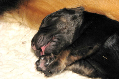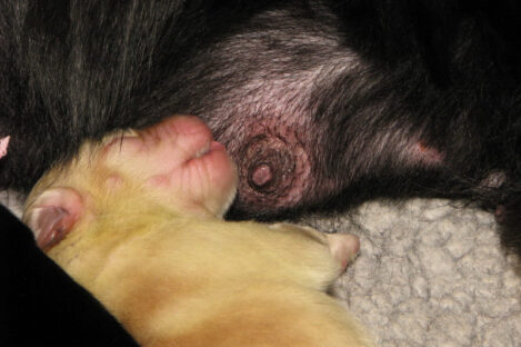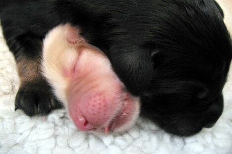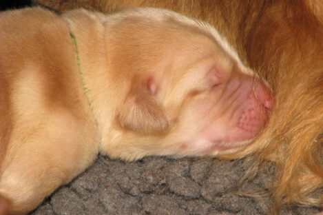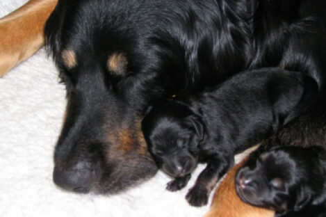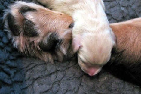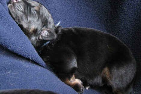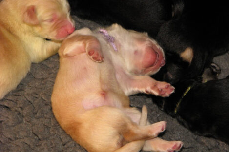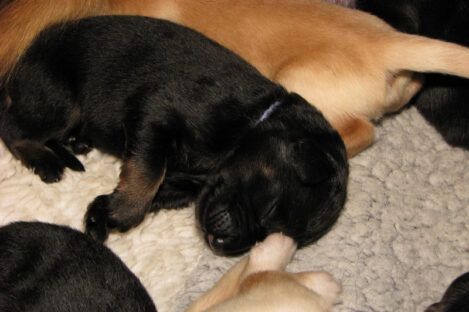 De pups zijn heel levendig. Klimmen over moeder heen en krabben zich zelfs al achter de oren. Ze liggen heerlijk met de buik bloot te dromen. Op de vierde dag waren de pups al gemiddeld 150 gram gegroeid. Een topprestatie van Raya. We zijn benieuwd hoeveel ze vanavond wegen.