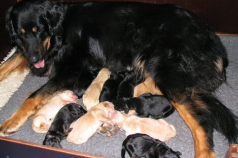 Één dag na de keizersnede is Raya nog wel wat zweverig. Ze ging met vier pupjes naar de dierenarts en kwam met tien stuks terug. Ze had niks in de gaten, misschien dacht ze dat ze dubbel zag. Verder vergeet ze af en toe een poepje op te ruimen en moesten wij (Yvonne en Ans) haar een handje helpen. Raya was natuurlijk naast moeder te zijn geworden ook een patiënt. Yvonne heeft de eerste nacht nachtdienst gehad. Als een volleerd verpleegkundige heeft zij zich van haar taak gekweten. De eerste dag na hun geboorte zijn alle pups al gegroeid en zien er lekker gevuld uit.