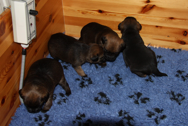 Het begint nu leuker te worden. De pups gaan echt met elkaar spelen. Ze werken met hun pootjes, happen in elkaar en rollen elkaar ondersteboven. En ze gaan daar in één keer ook behoorlijk geluid bij maken, echte terriërs! We vonden dat het ook tijd werd om de kamerkennel neer te zetten. Ze krijgen dan meer ruimte om te bewegen. In de komende week zullen ze dat gaan ontdekken.