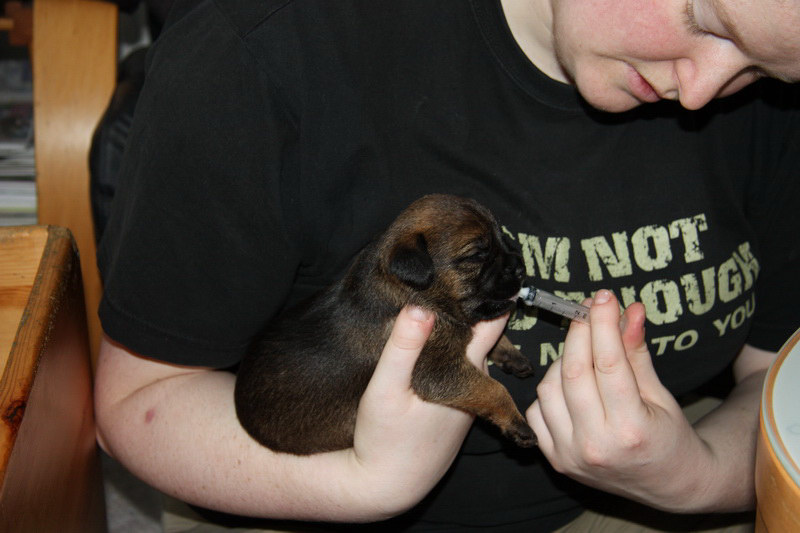 Ze zijn ook al goed aan de pap gewend. Ze vinden het heerlijk. We zijn ze nu aan het leren om het van een schoteltje te likken. Soms lukt dat, maar soms zijn ze liever lui dan moe en vinden ze het best als ze het in hun bek gespoten krijgen. En natuurlijk is een maaltje bij moeders nog altijd het lekkerste!