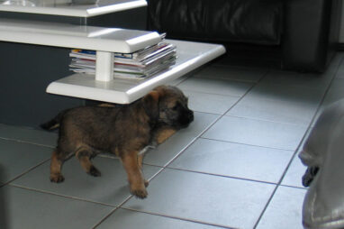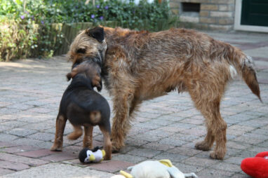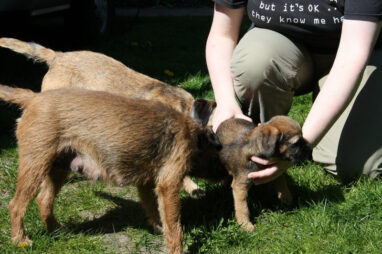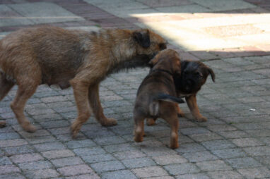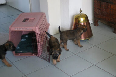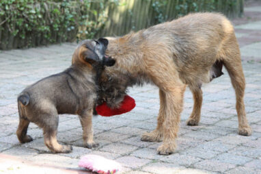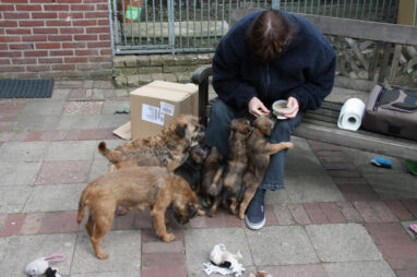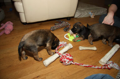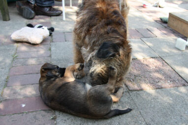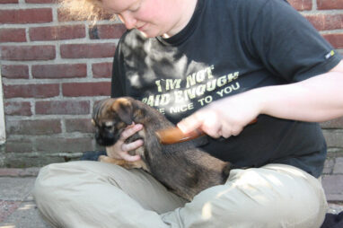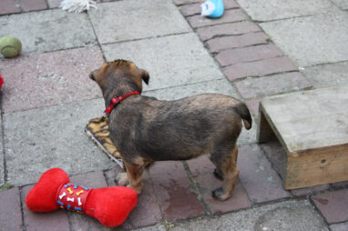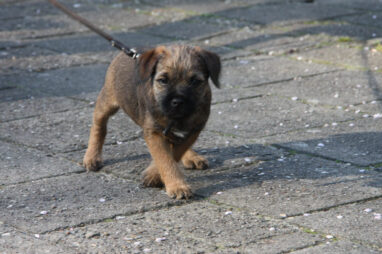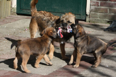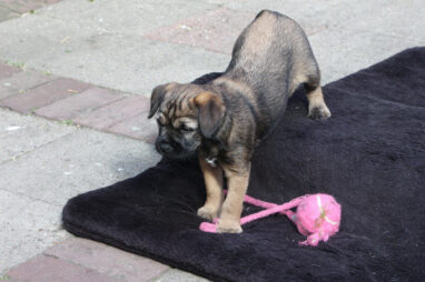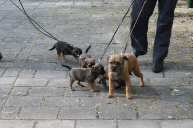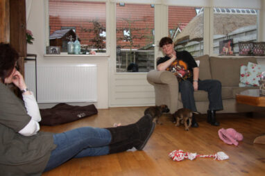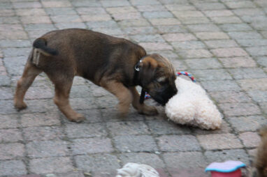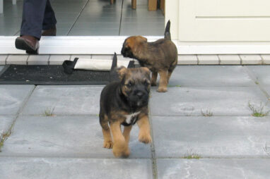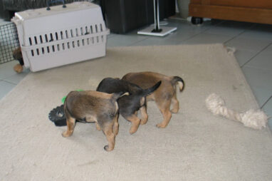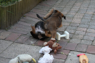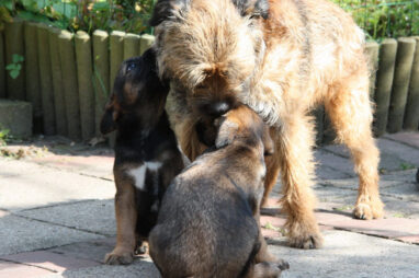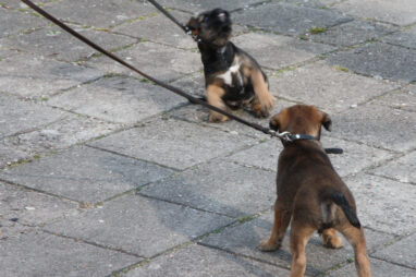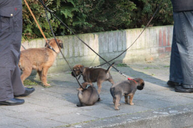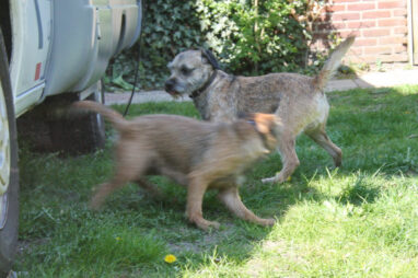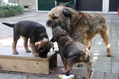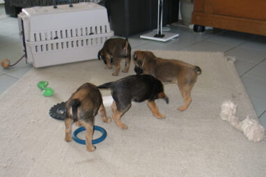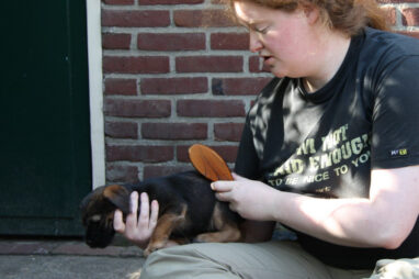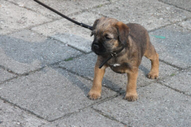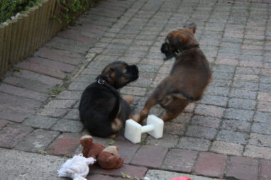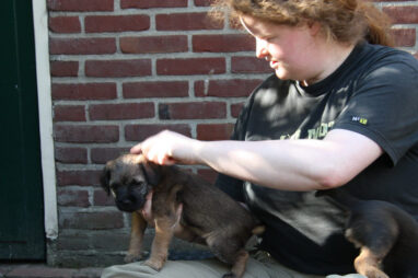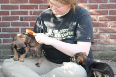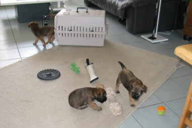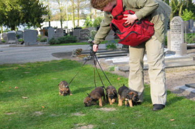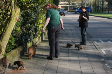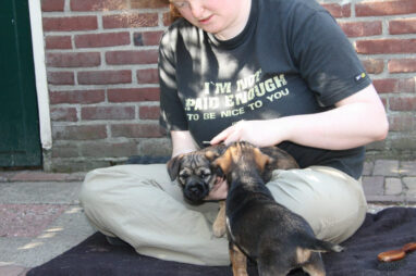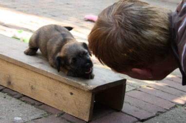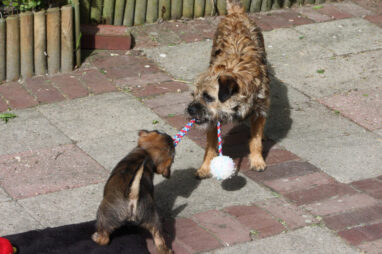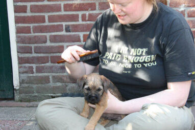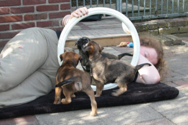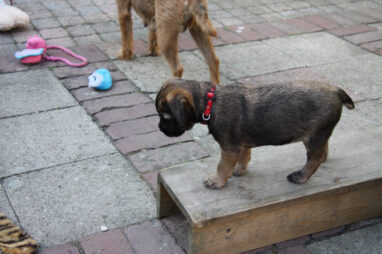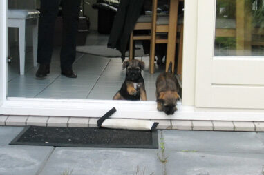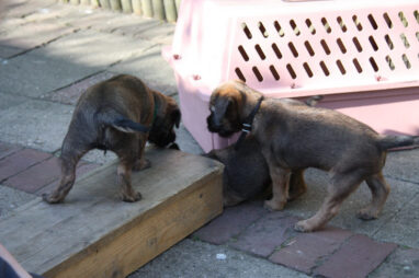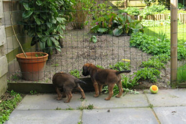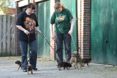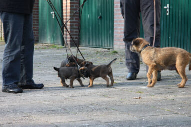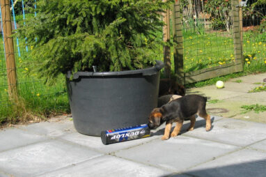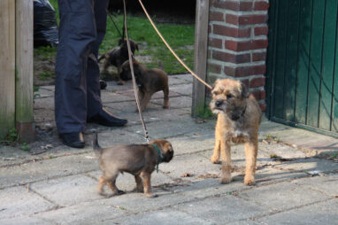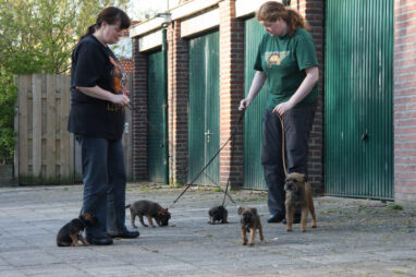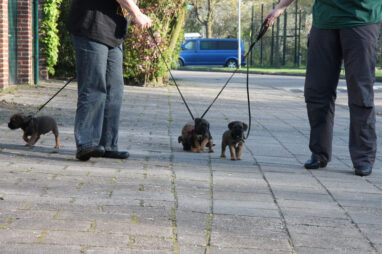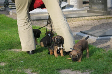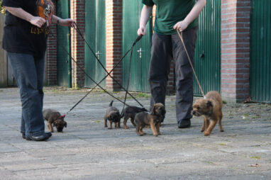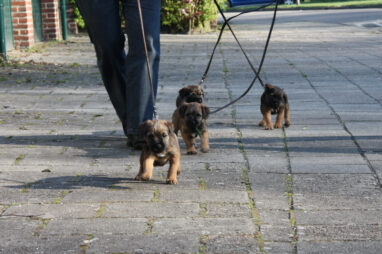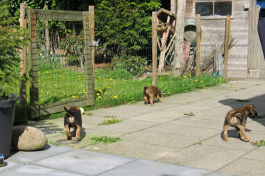 Het is alweer de eerste dag van de laatset week. Aanstaande zaterdag gaan de pups naar hun nieuwe baasjes. En die hebben er allemaal al zo’n zin in! Wij hebben in ieder geval nog een paar dagen om leuke dingen met de pups te doen. En één daarvan is wandelen. We hebben de pups al aan de halsbandjes laten wennen. Nu dus de wijde wereld in. Dat vonden de pups best onwennig. Gesteund door Fudge hebben we een (heel) klein stukje met ze gelopen. Dat valt nog niet mee, vier van die springers in bedwang houden. Ze willen allemaal een andere kant op. Er is ook zoveel te zien. En thuis gekomen moeten ze hun spanning even afreageren.