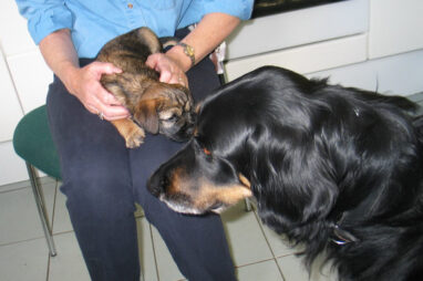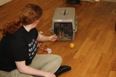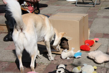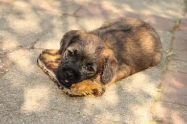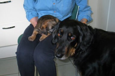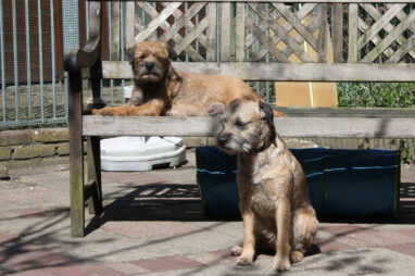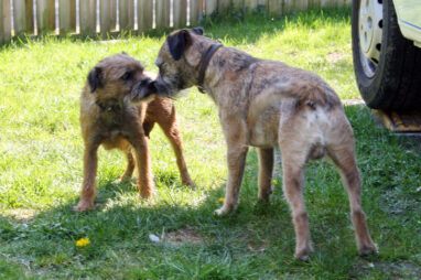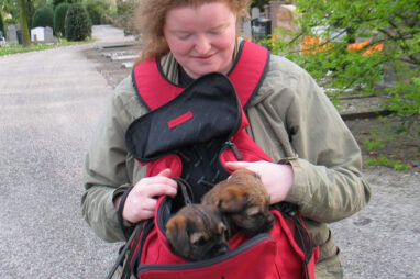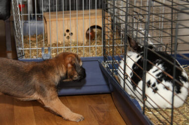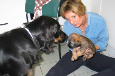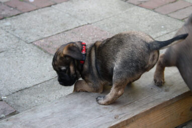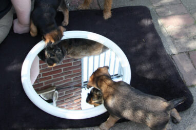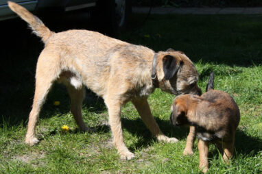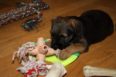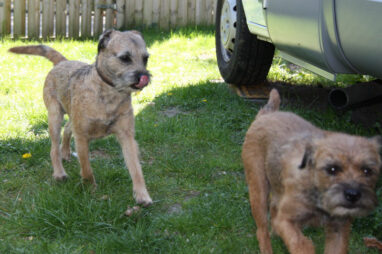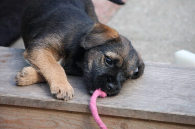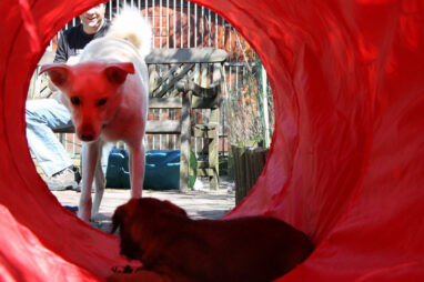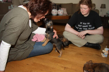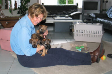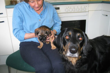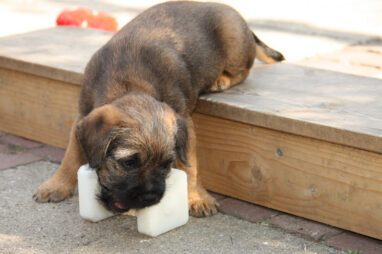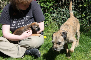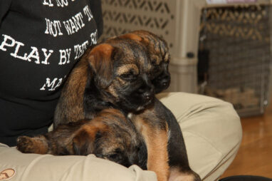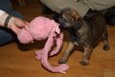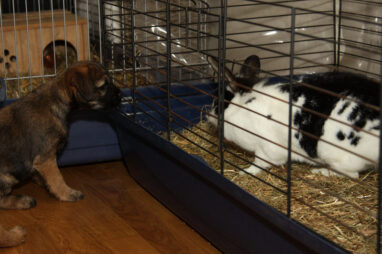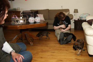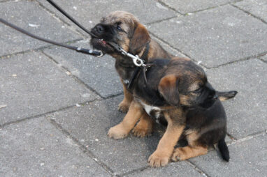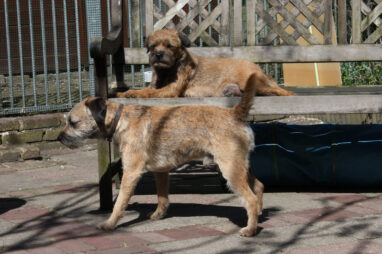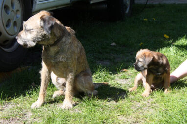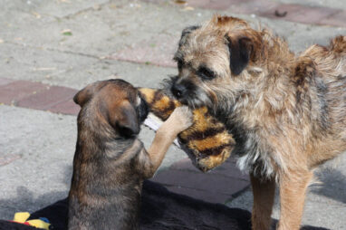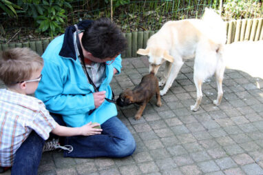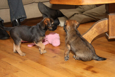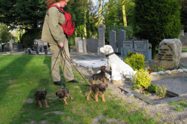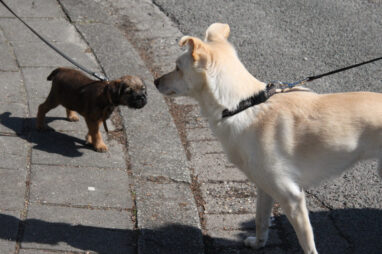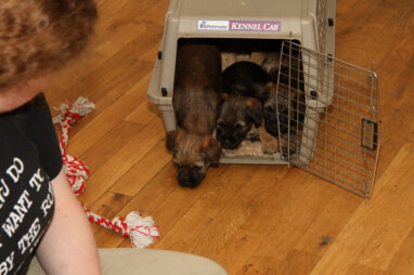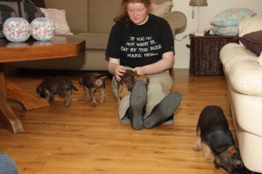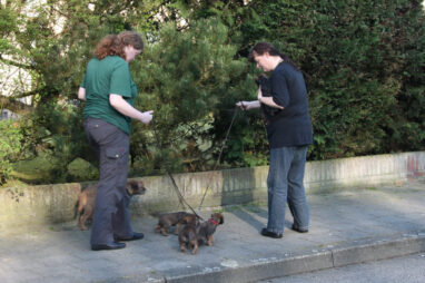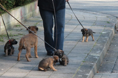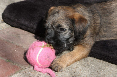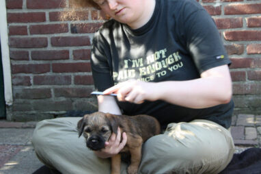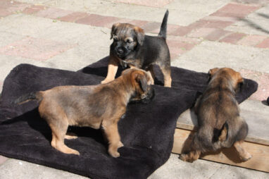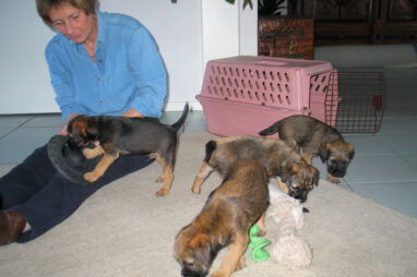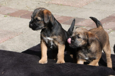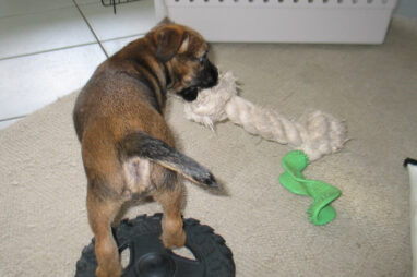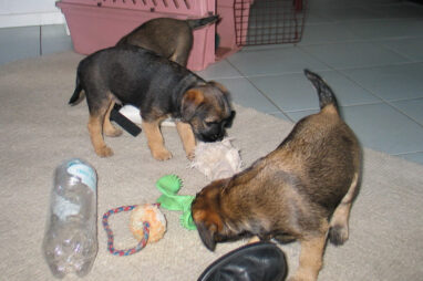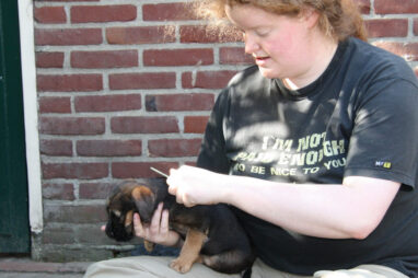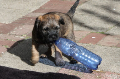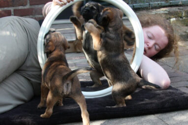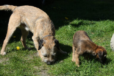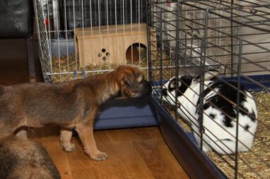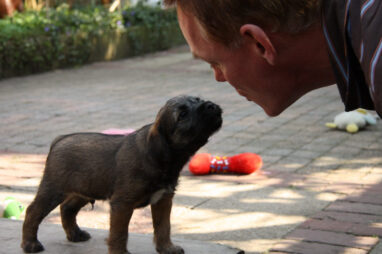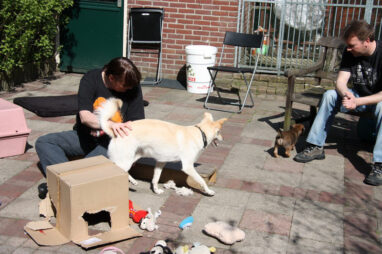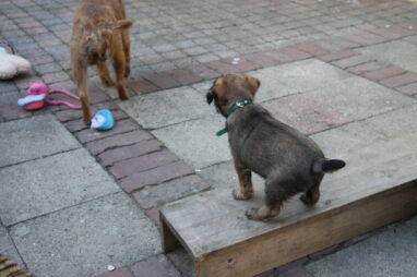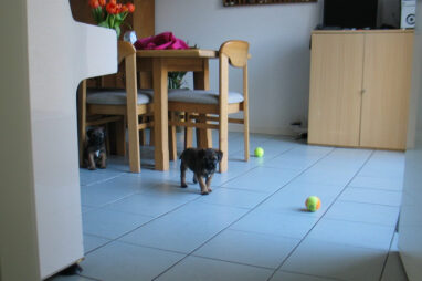Het is alweer de eerste dag van de laatset week. Aanstaande zaterdag gaan de pups naar hun nieuwe baasjes. En die hebben er allemaal al zo’n zin in! Wij hebben in ieder geval nog een paar dagen om leuke dingen met de pups te doen. En één daarvan is wandelen. We hebben de pups al aan de halsbandjes laten wennen. Nu dus de wijde wereld in. Dat vonden de pups best onwennig. Gesteund door Fudge hebben we een (heel) klein stukje met ze gelopen. Dat valt nog niet mee, vier van die springers in bedwang houden. Ze willen allemaal een andere kant op. Er is ook zoveel te zien. En thuis gekomen moeten ze hun spanning even afreageren.