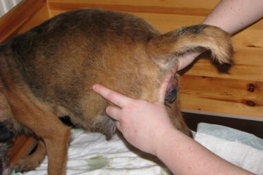We weten van de röntgenfoto van gisteren dat er vier pups in totaal moeten komen. Het wachten is dus op de laatste. Het duurt lang en zo te voelen zit de laatste pup nog hoog in de buik. Voor de zekerheid gaat Ans met Fudge langs de dierenarts. De pup is inmiddels al wat afgedaald, maar moet binnen 2 uur komen anders wordt het een keizersnee.