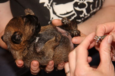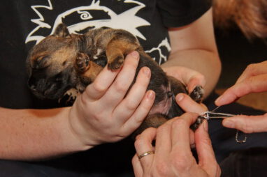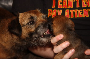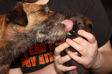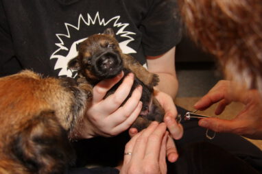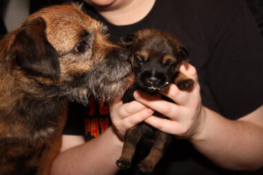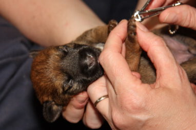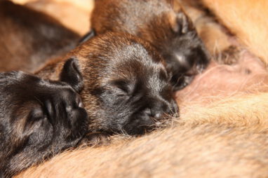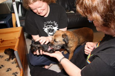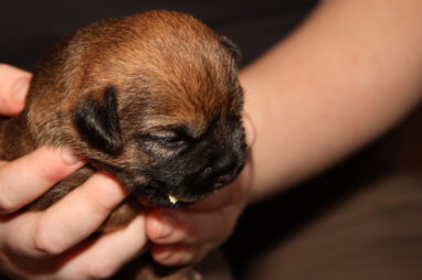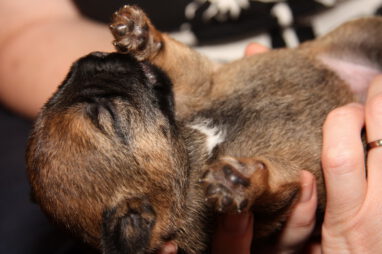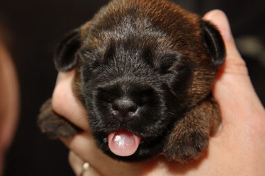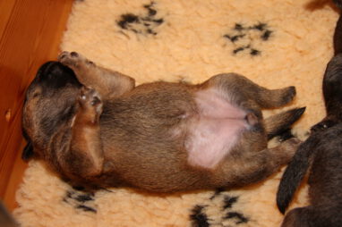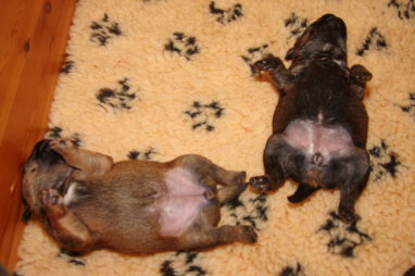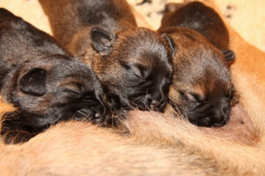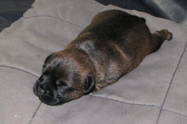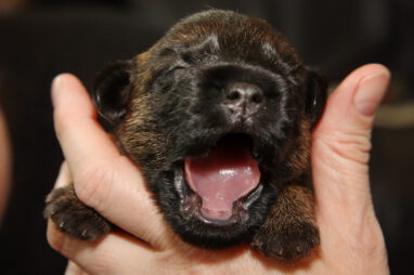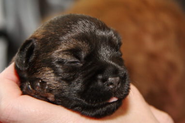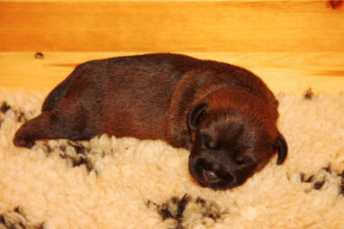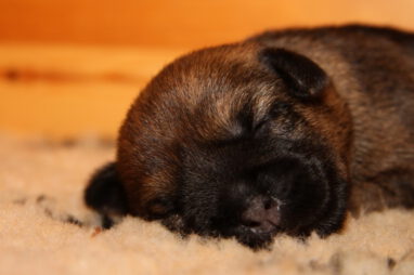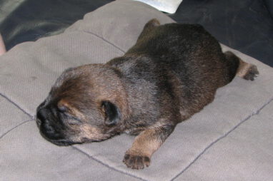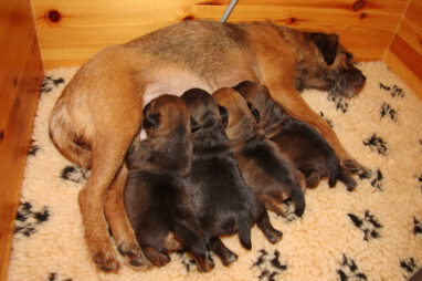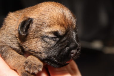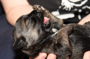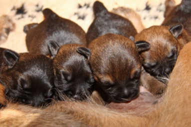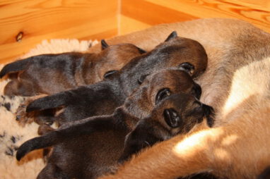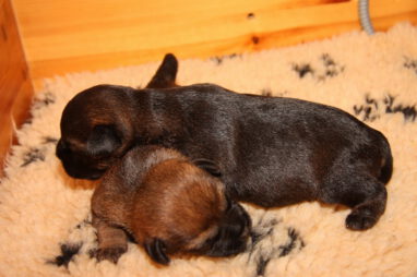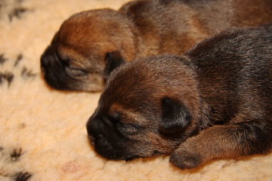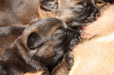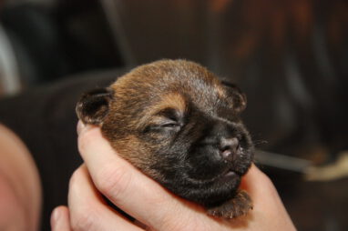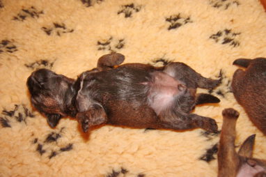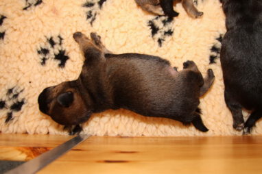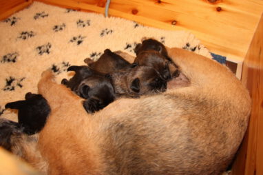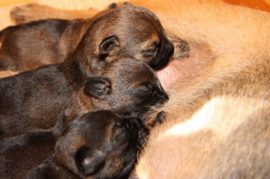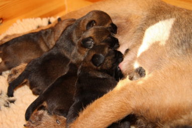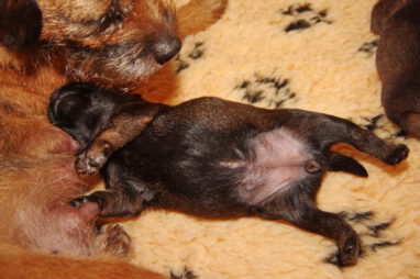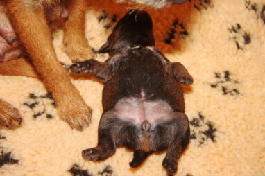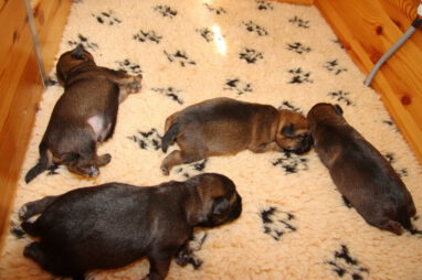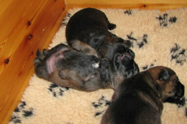 We zijn de tweede week alweer in gegaan, de tijd gaat heel snel. Er is weer een ritme in ons dagelijks leven gekomen. Fudge verzorgt de pups uitstekend, ze gaat op tijd naar de pups om ze te laten drinken en ze houdt de werpkist heel mooi schoon. Ze ligt nu niet meer de hele dag bij de pups, maar houdt ze wel heel goed in de gaten.