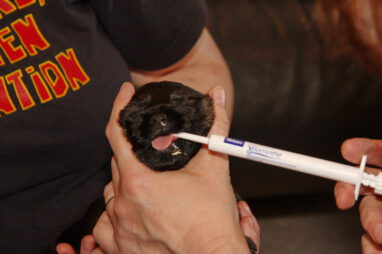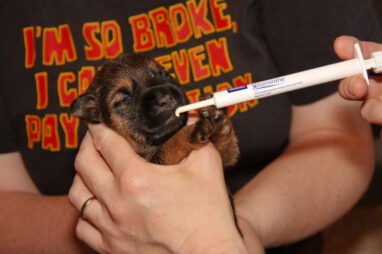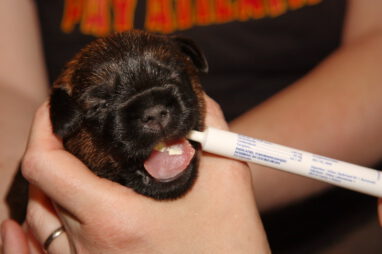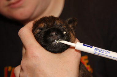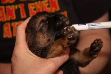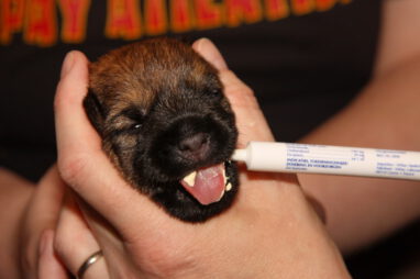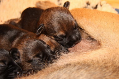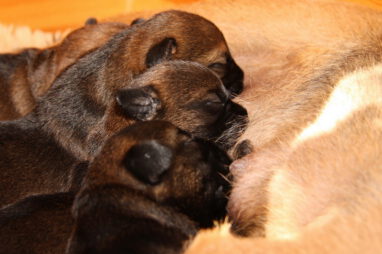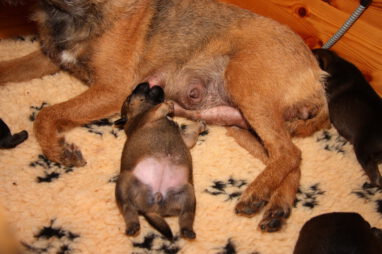 De pups zijn heel tevreden, je hoort ze alleen heel af en toe als ze vinden dat de melk niet snel genoeg komt. Op de foto’s is goed te zien hoeveel de pups al gegroeid zijn en hoe heerlijk ze kunnen drinken bij Fudge.