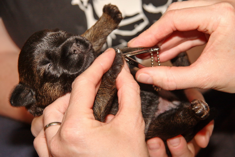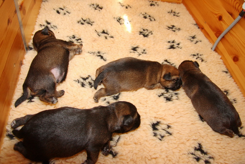 We zijn de tweede week alweer in gegaan, de tijd gaat heel snel. Er is weer een ritme in ons dagelijks leven gekomen. Fudge verzorgt de pups uitstekend, ze gaat op tijd naar de pups om ze te laten drinken en ze houdt de werpkist heel mooi schoon. Ze ligt nu niet meer de hele dag bij de pups, maar houdt ze wel heel goed in de gaten.