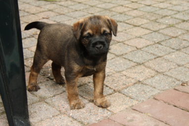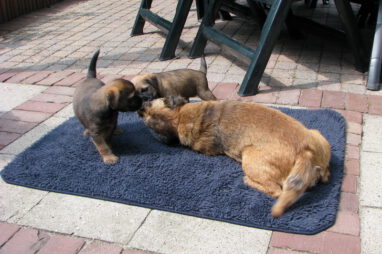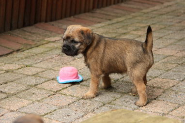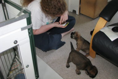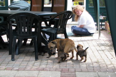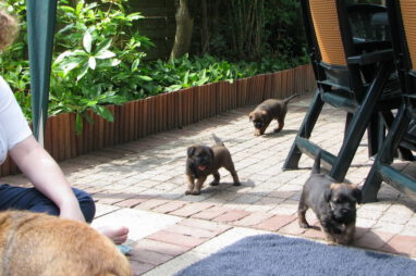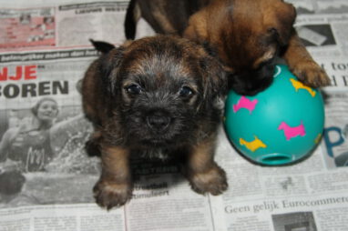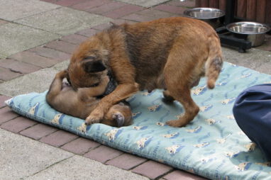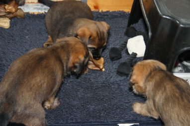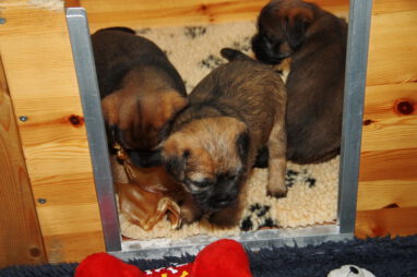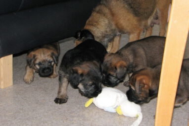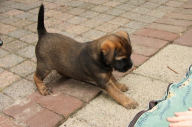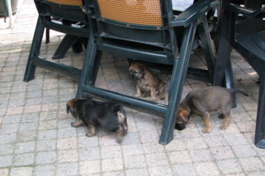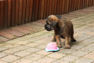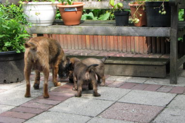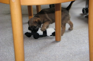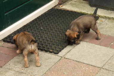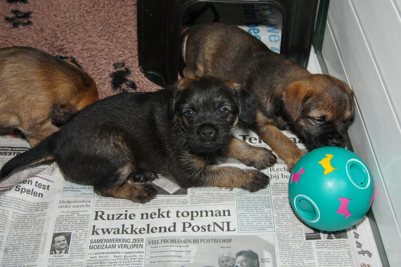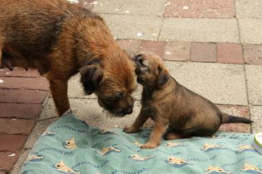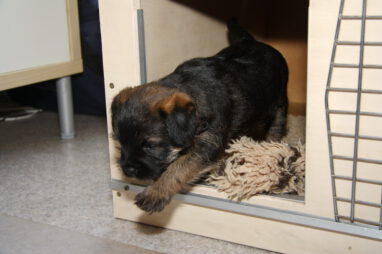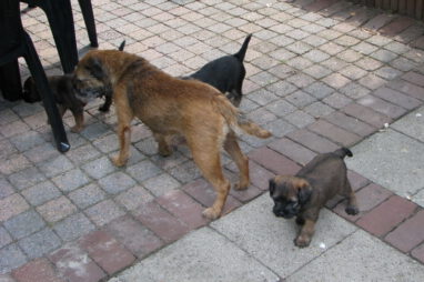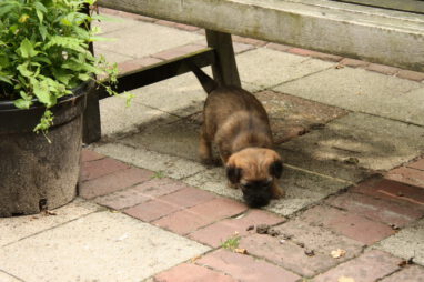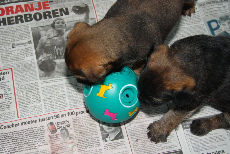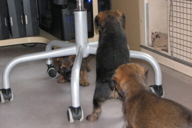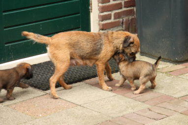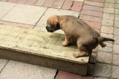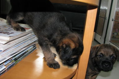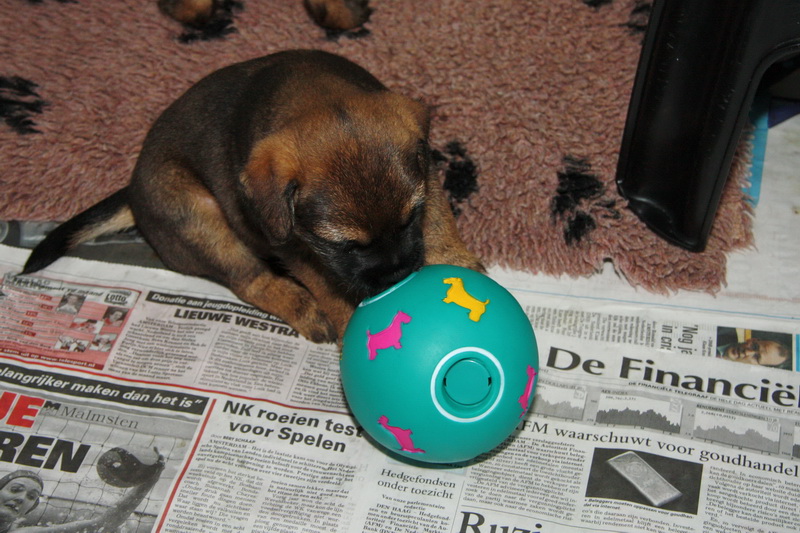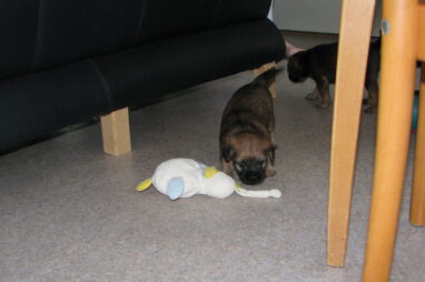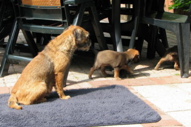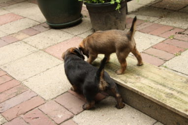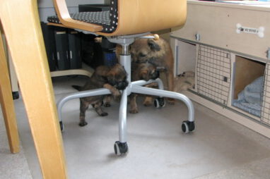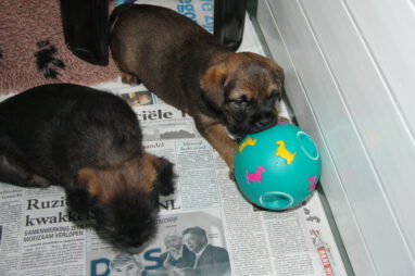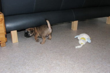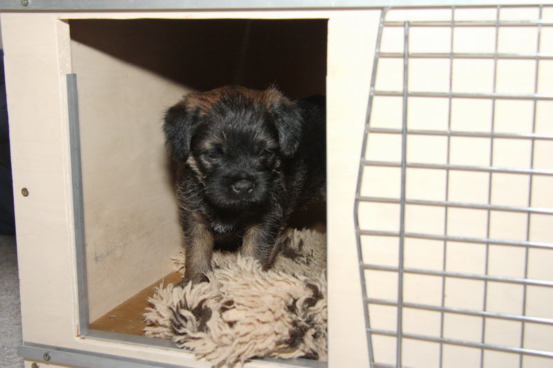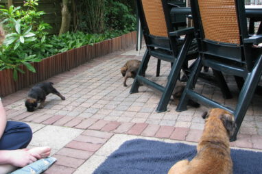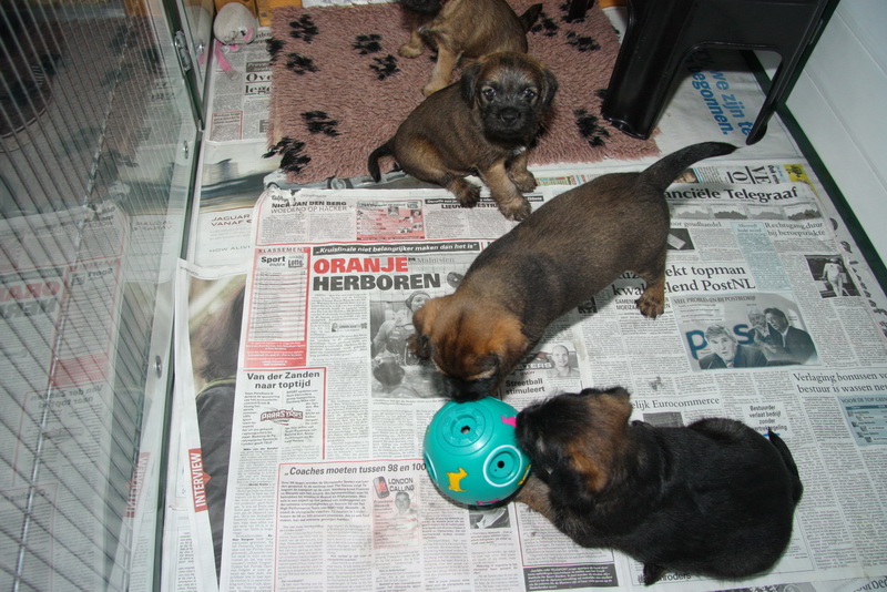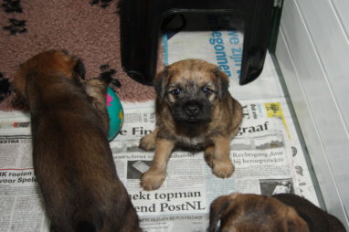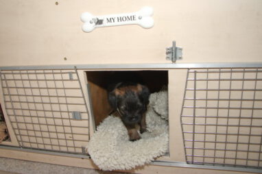 Josie is een echte onderzoekster. Op haar tocht door de woonkamer kwam ze bij de benches van de volwassen borders. Dat moest natuurlijk onderzocht worden. Het eerste hok werd geïnspecteerd en uitgeprobeerd,maar het beviel toch niet helemaal. Daarna kwam een bezichtiging van het tweede hok. Een woning naast moeder, wat wil een pup nog meer. Josie denkt nu serieus over een verhuizing!