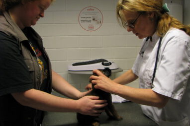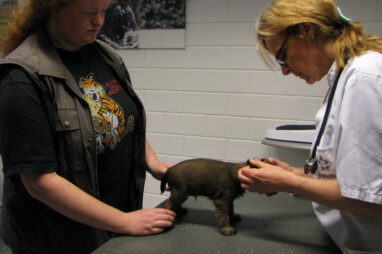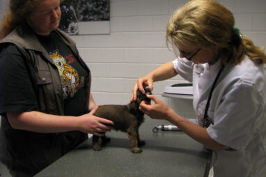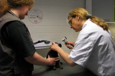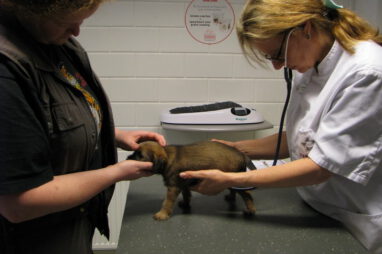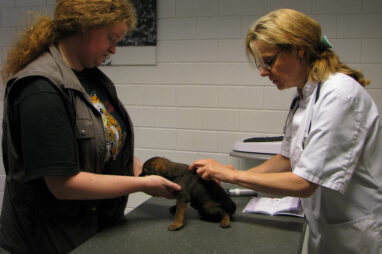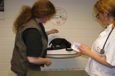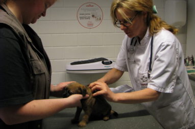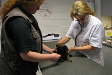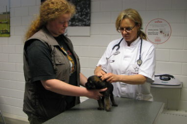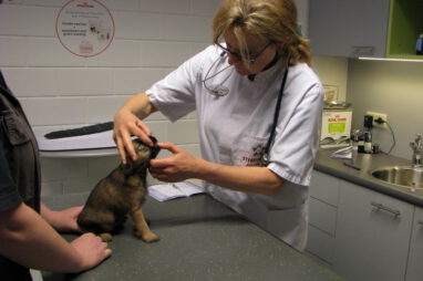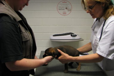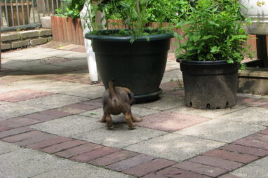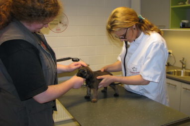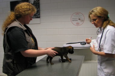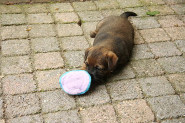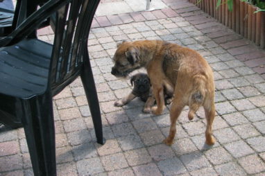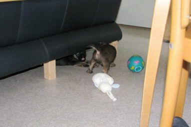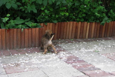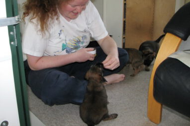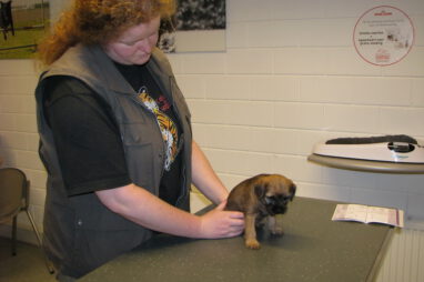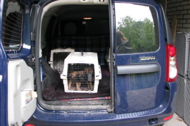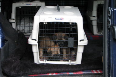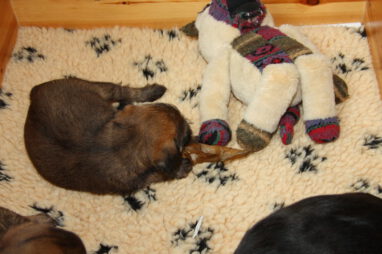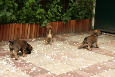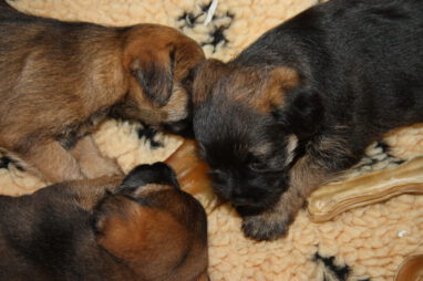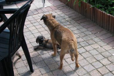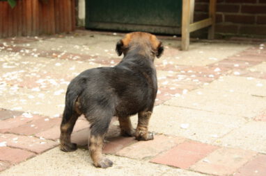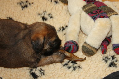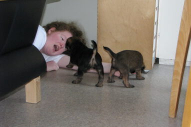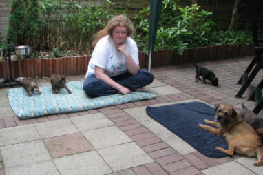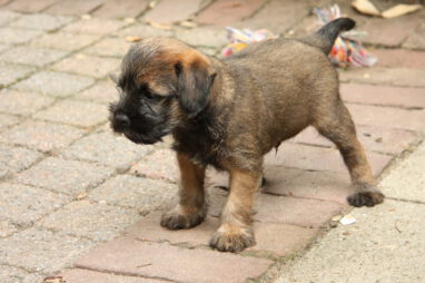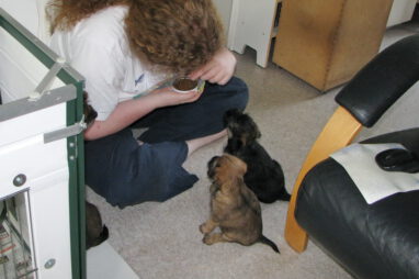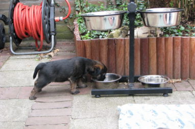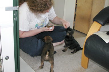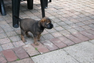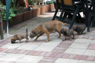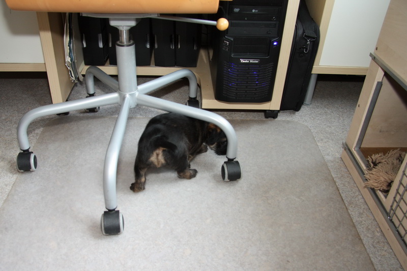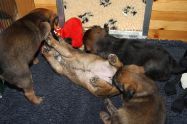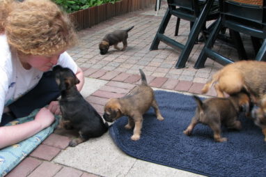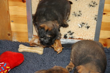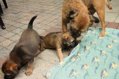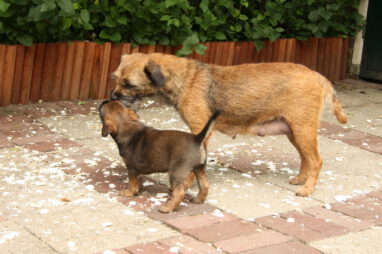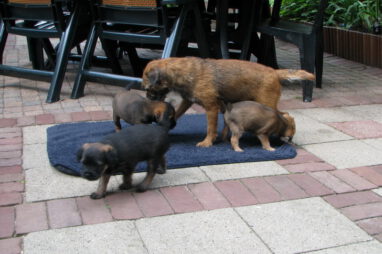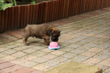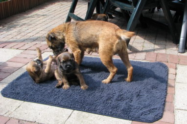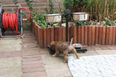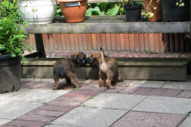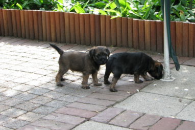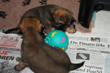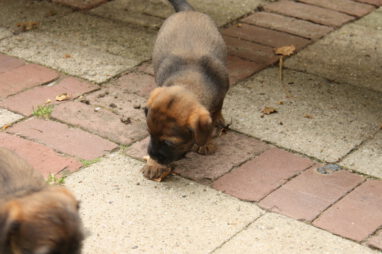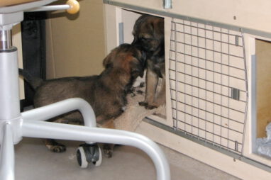 Josie is een echte onderzoekster. Op haar tocht door de woonkamer kwam ze bij de benches van de volwassen borders. Dat moest natuurlijk onderzocht worden. Het eerste hok werd geïnspecteerd en uitgeprobeerd,maar het beviel toch niet helemaal. Daarna kwam een bezichtiging van het tweede hok. Een woning naast moeder, wat wil een pup nog meer. Josie denkt nu serieus over een verhuizing!