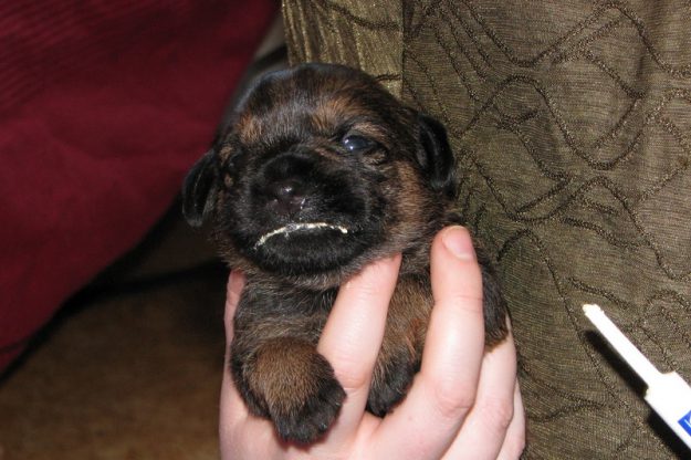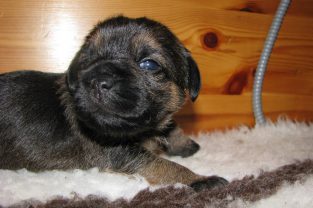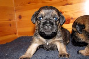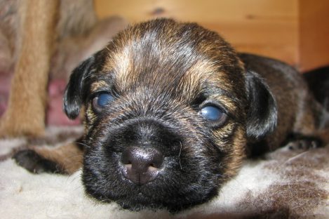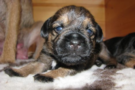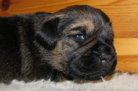 De pups hebben hun ogen nu echt open. Ze kunnen nog niet scherp zien, maar reageren duidelijk op licht en donker. Grappig is dat pups altijd blauwachtige ogen hebben en pas na een paar weken hun echte oogkleur krijgen.