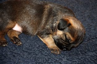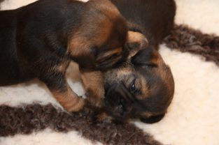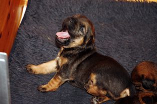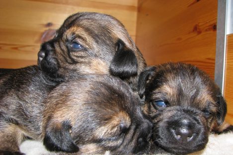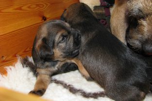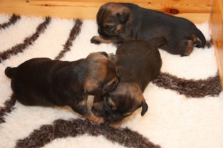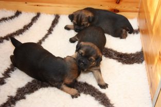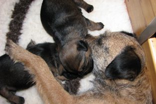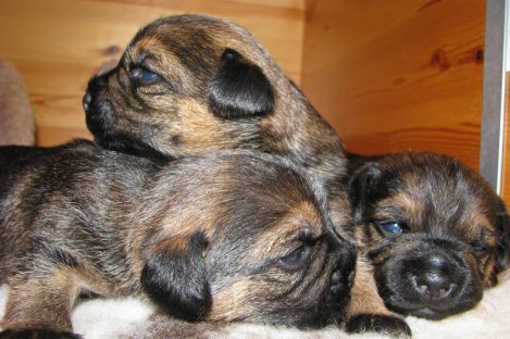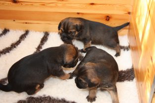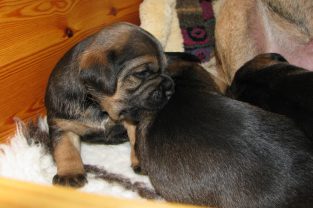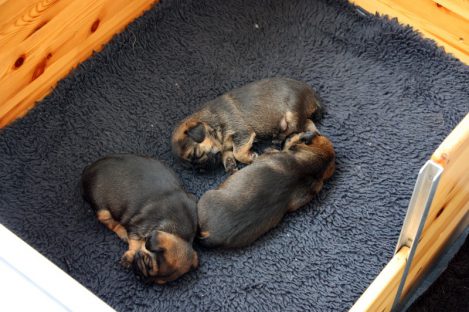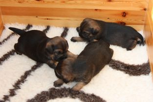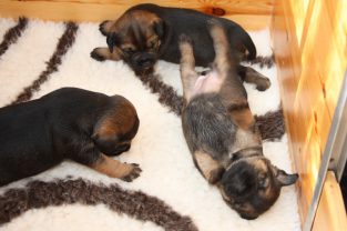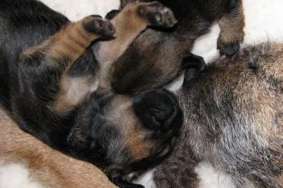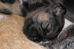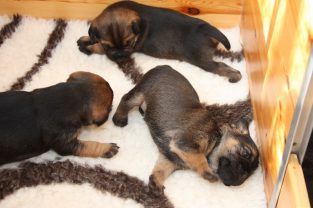 De pups slapen nog steeds heel veel. Die rust hebben ze ook nodig om te kunnen groeien. Als ze actief zijn is dat maar voor een paar minuten en dan vallen ze weer als in blok in slaap. Ze kunnen er heerlijk relaxed bij liggen, dat hebben ze waarschijnlijk van hun moeder.