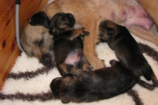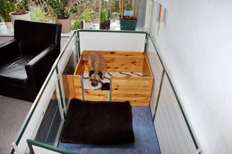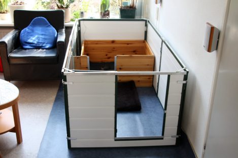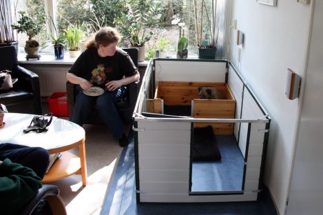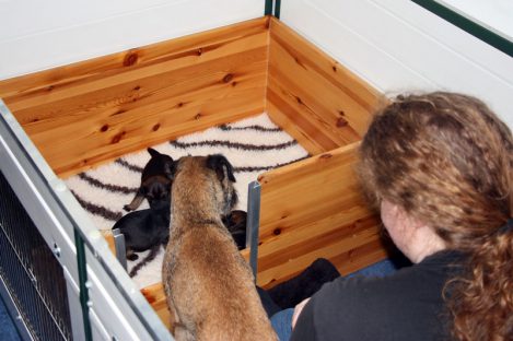 De pups zijn verhuisd naar de kamerkennel in de woonkamer. Ivy vond dat maar heel vreemd. Ze wist niet goed wat er ging gebeuren en waar haar pups naar toe gingen. Maar Marloes heeft Ivy op haar gemak gesteld en toen Ivy eenmaal door had wat de nieuwe situatie was, kwam ze tot rust en ging weer lekker bij haar pups liggen. En de pups…., die maakt het allemaal nog niets uit, zolang ze maar een lekker plekje hebben om te slapen en moeder het eten komt brengen.