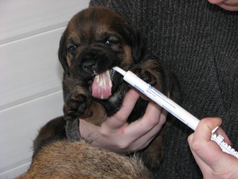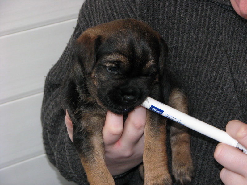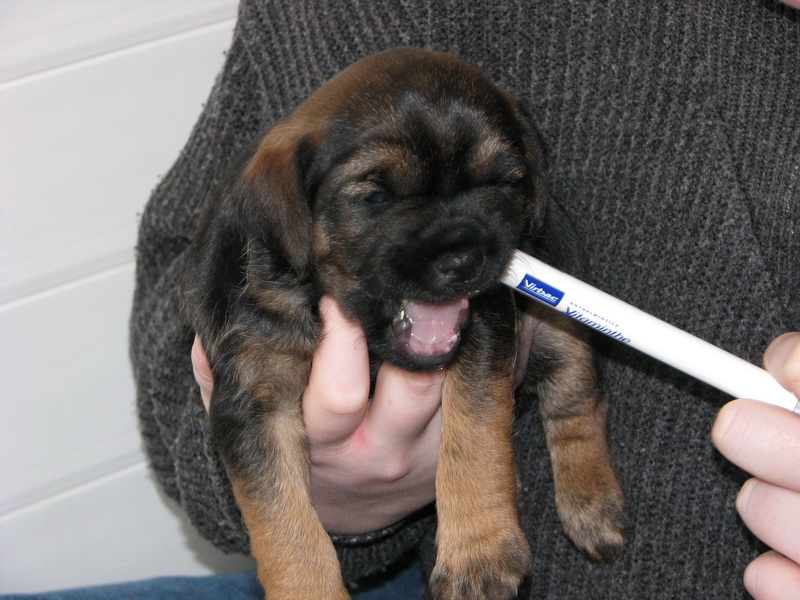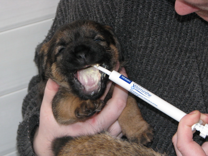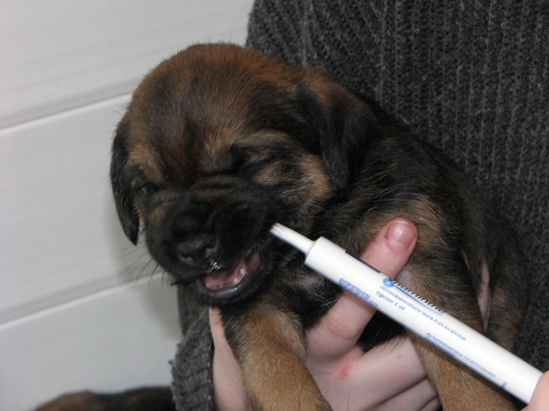 De pups zijn voor de tweede keer ontwormd. Erg lekker vinden ze die pasta niet. Maar bij Marloes helpt tegenstribbelen niet, dus ze slikken het toch maar snel door.