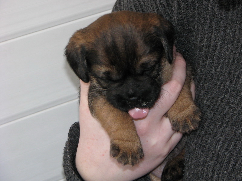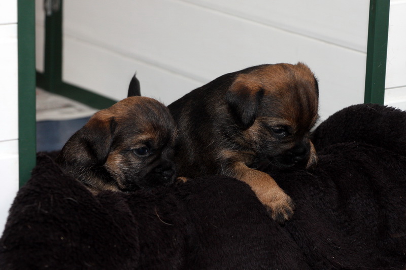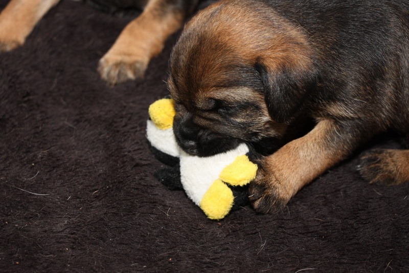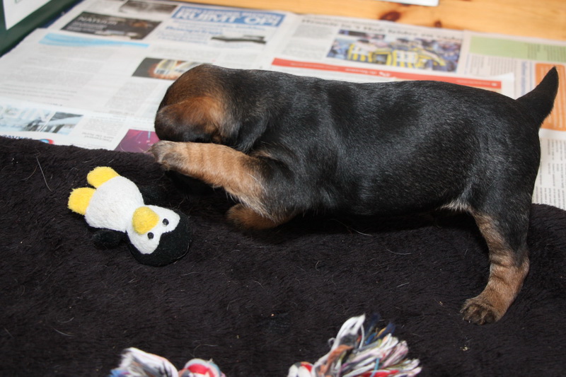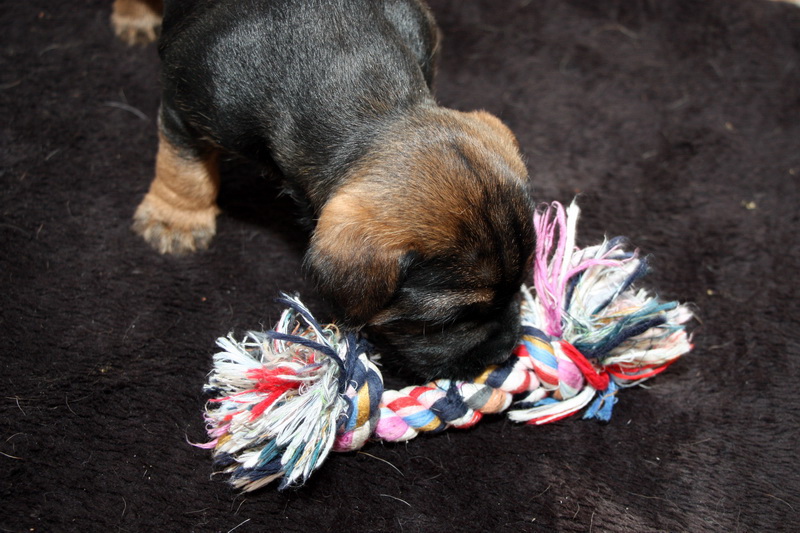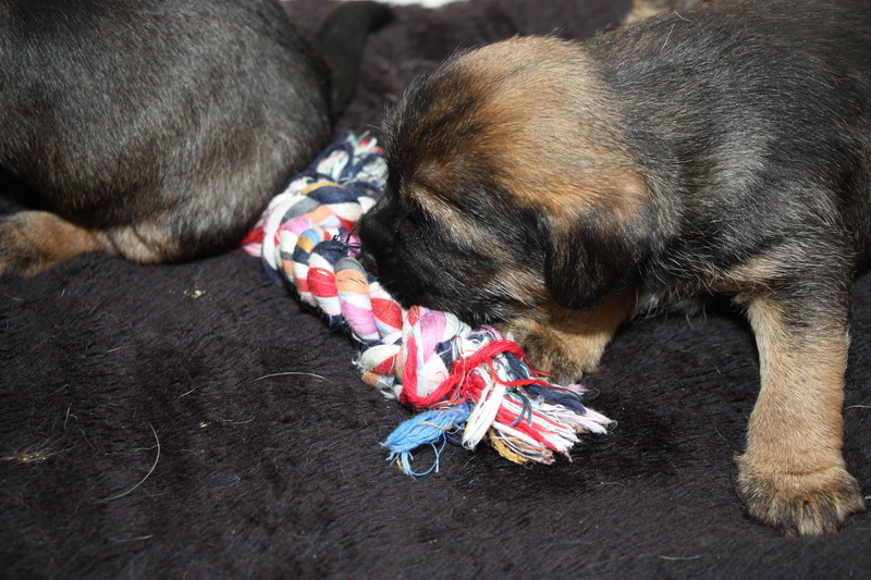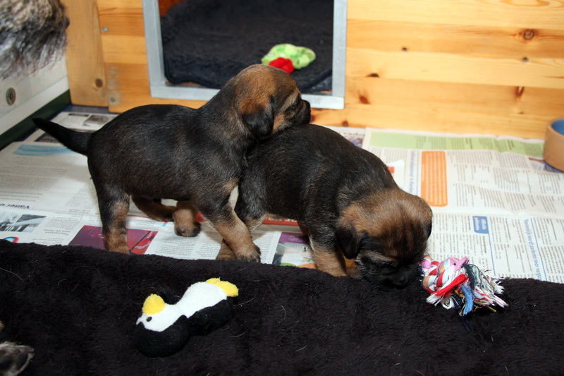 De pups gaan steeds woester met elkaar en met het speelgoed spelen. Er wordt gegromd, geduwd, omgerold en (zachtjes) gebeten. En ze doen absoluut niet voor elkaar onder! Er is geen echte baas, het wisselt elkaar voortdurend af. Nieuwe speeltjes moeten dood geschud’ worden, wat af en toe met zo’n grote flos niet meevalt. Ze hebben nu een eigen drinkbak in de kennel waar ze na het spelen dankbaar gebruik van maken.