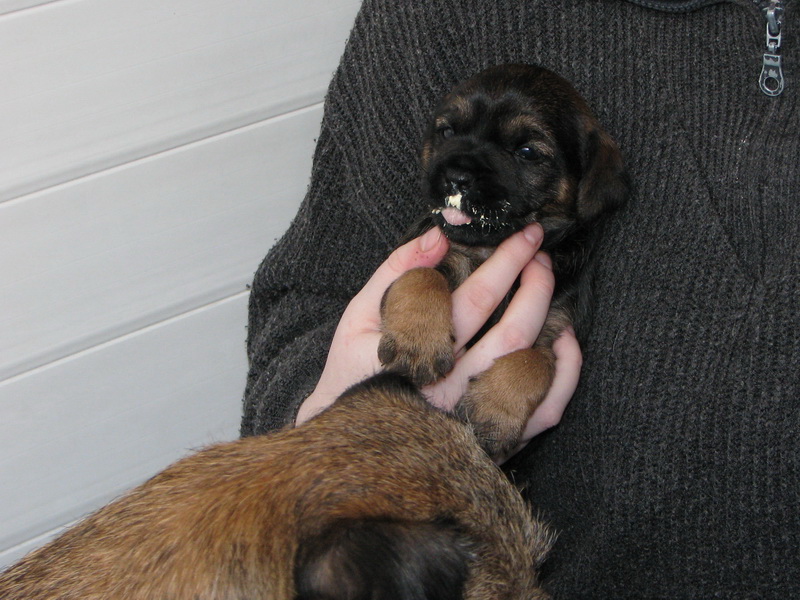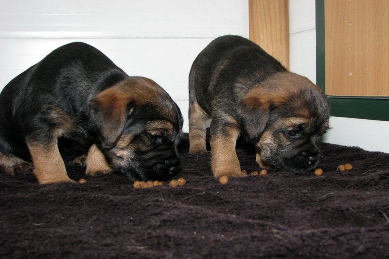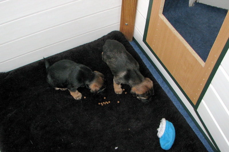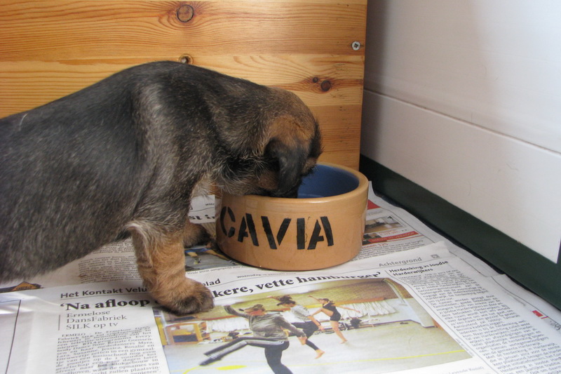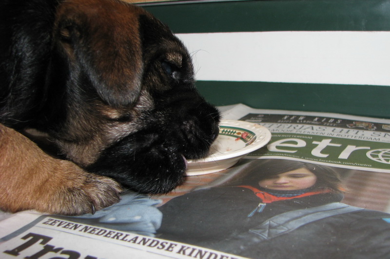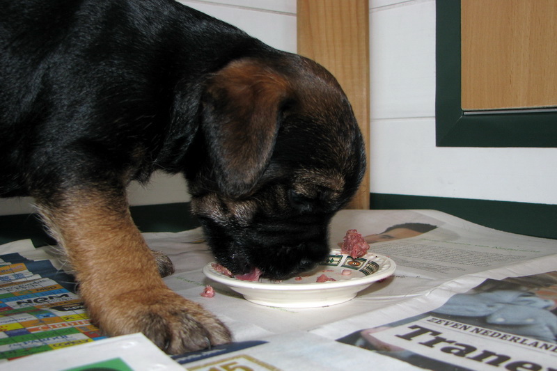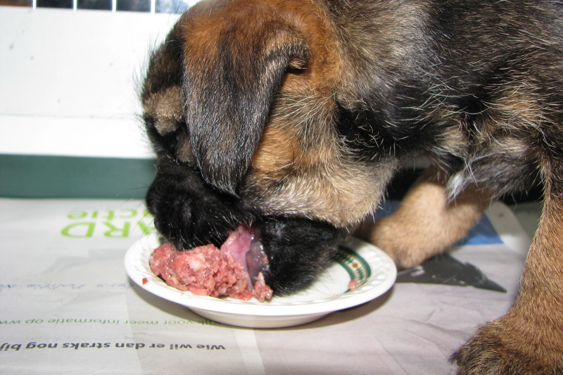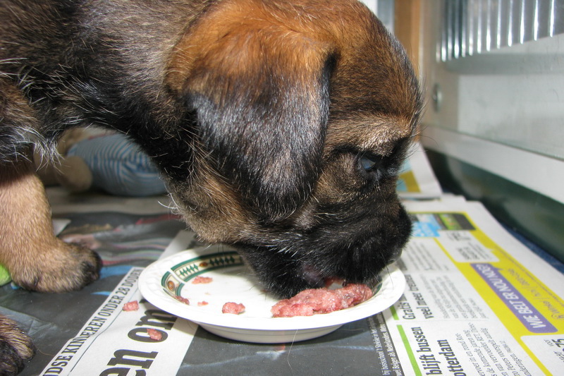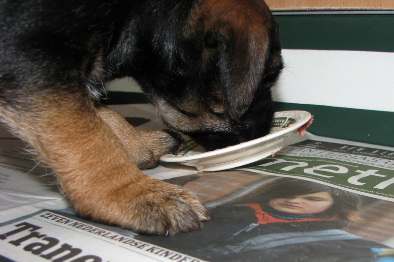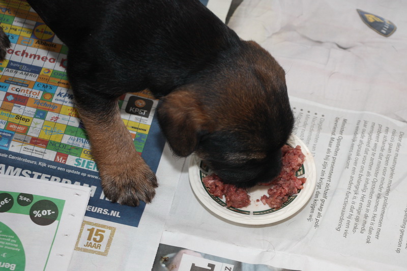 De pups hadden tot nu toe Royal Canin Starter als vast(er) voedsel gekregen. Nu hebben we ze voor de eerste keer Carnibest pup gevoerd. Lekker dat ze het vonden! De bordjes waren twee keer zo snel leeg en ook nog keurig afgewassen (jammer voor Ivy). Van nu af aan krijgen de pups vier maal daags een portie Carnibest.