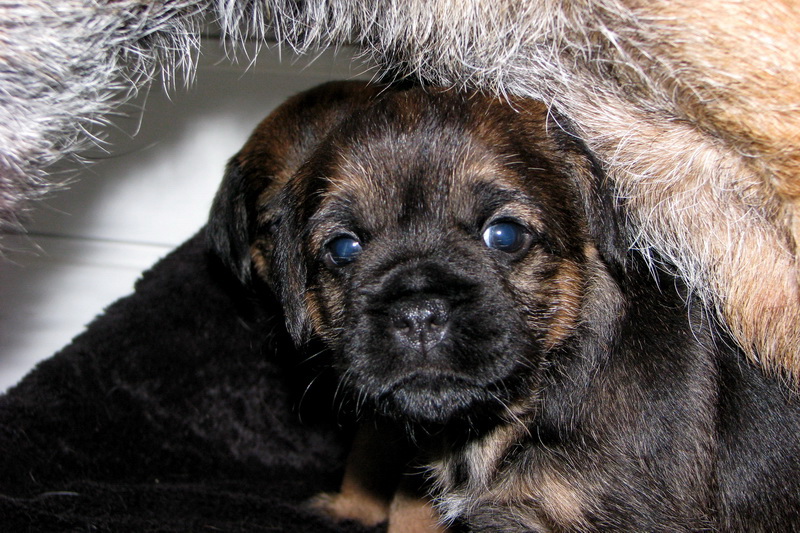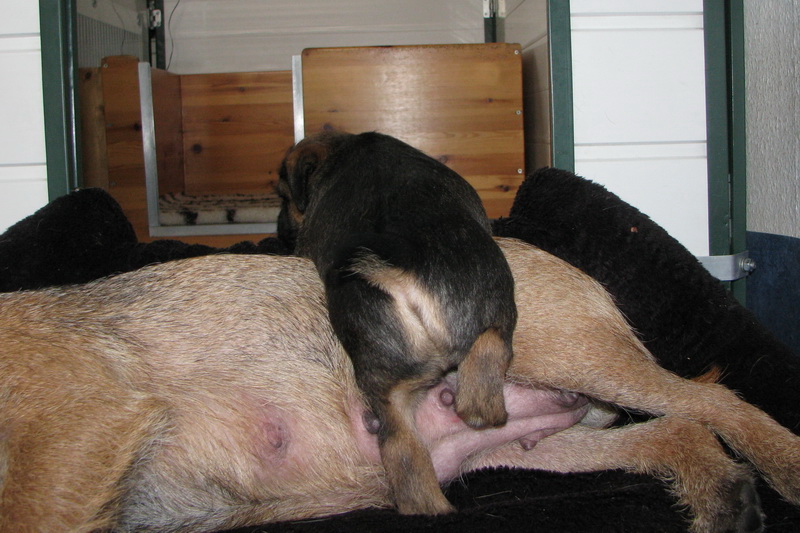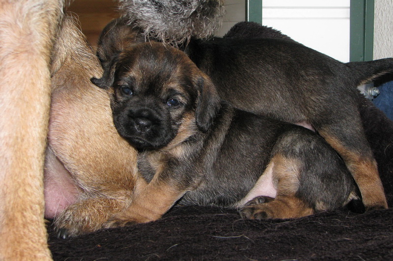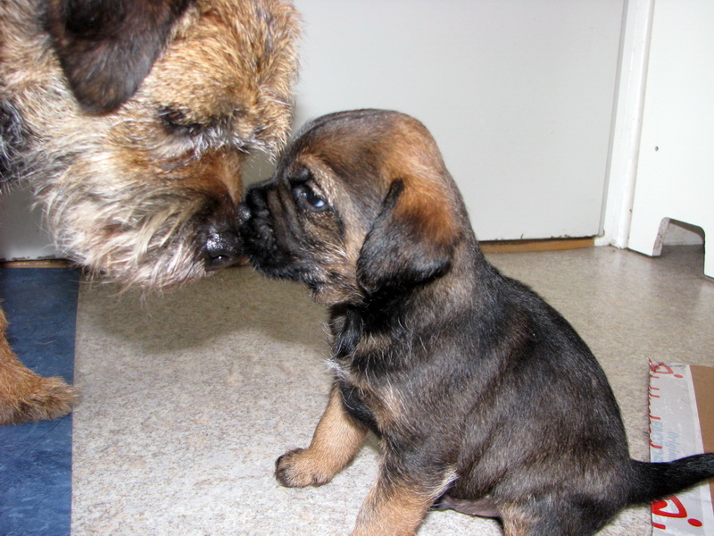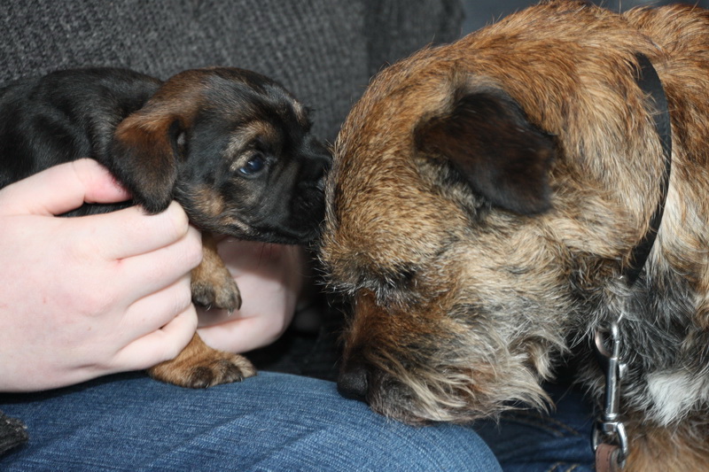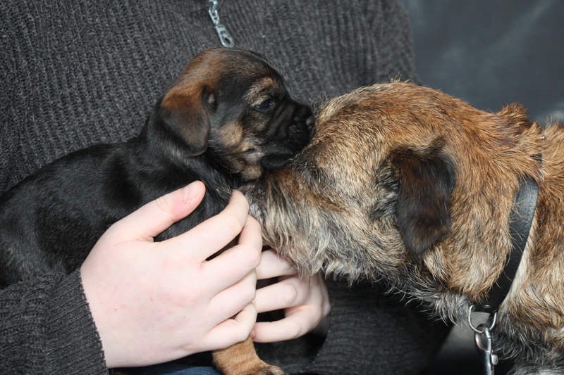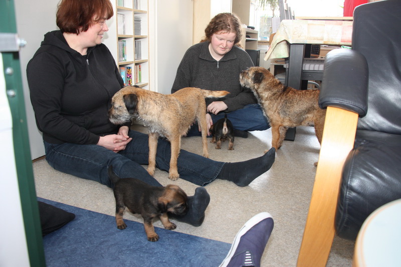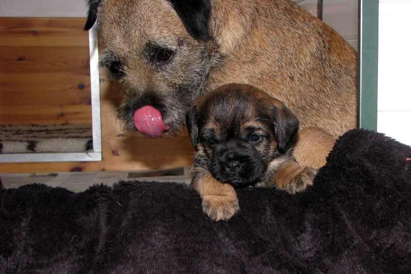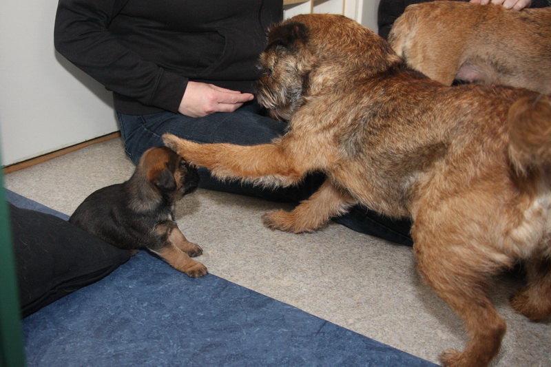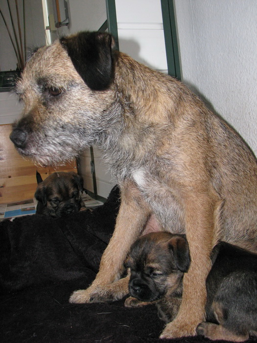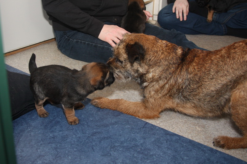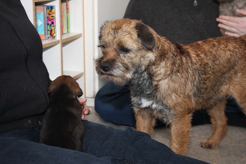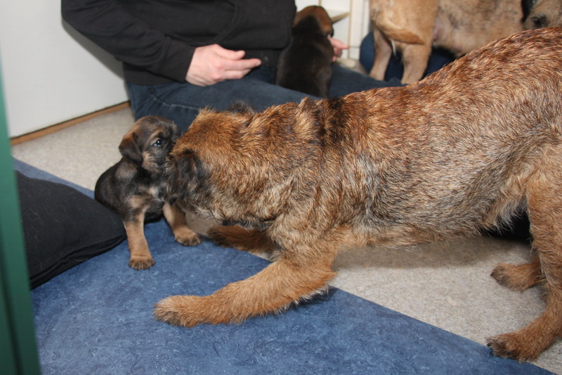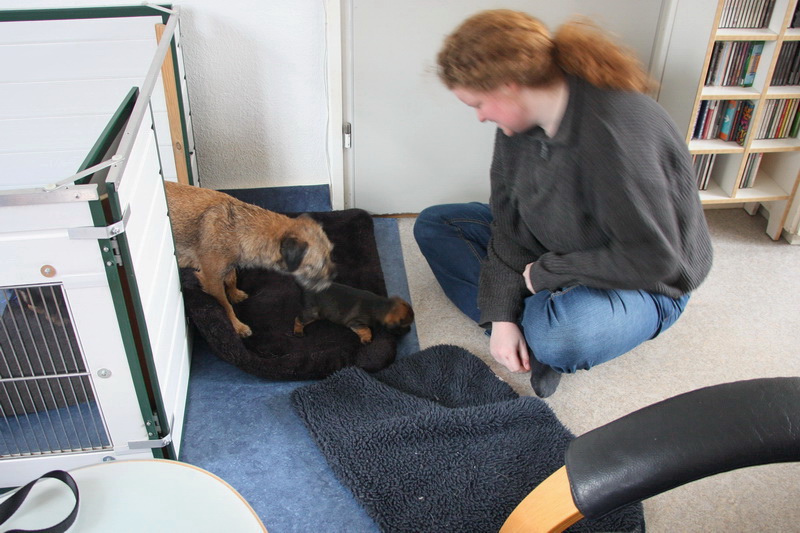 We hadden Fudge de eerste weken bij de pups weggehouden. We hadden het idee dat ze wel eens de moederrol van Ivy over zou willen nemen omdat ze zo dol is op puppy’s. We hebben wel af en toe een pup bij Fudge gezet zodat ze aan elkaar konden wennen. Nu de pups zelfstandiger worden mag Fudge er gewoon bij. Oma Fudge vindt het prachtig en wil graag met de pups spelen. Alleen doet ze dat af en toe nog wat te wild en moeten we haar een beetje afremmen. En al het moederen laat oma gelukkig aan dochter Ivy over.