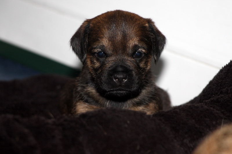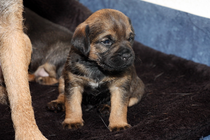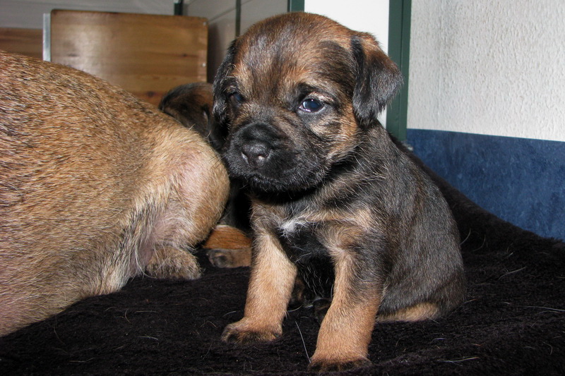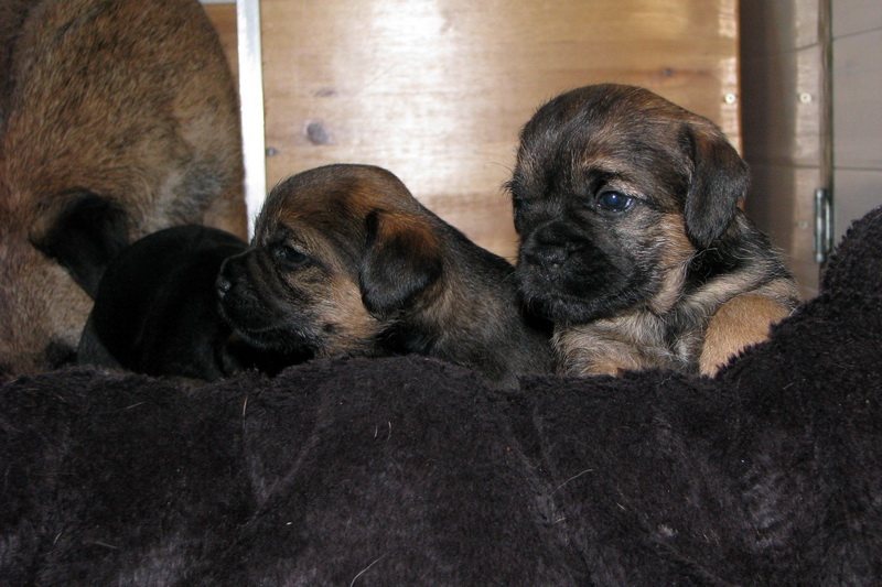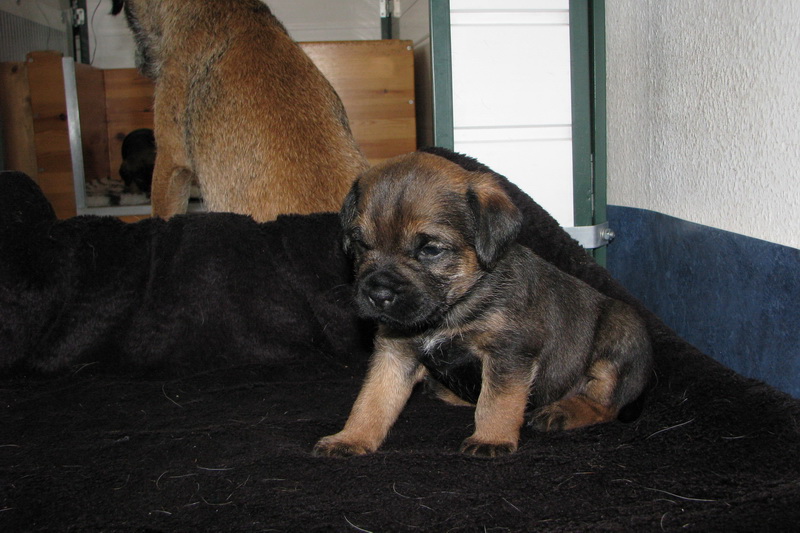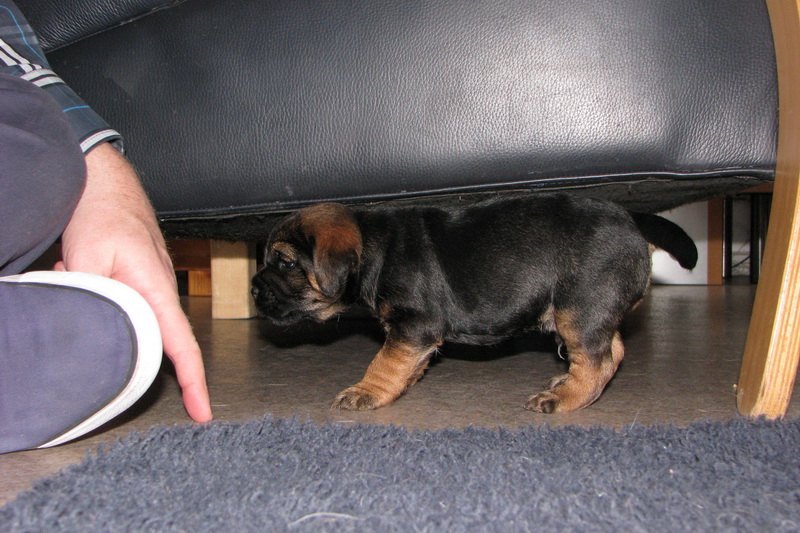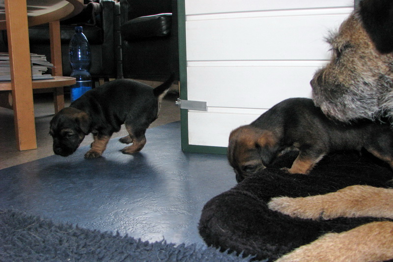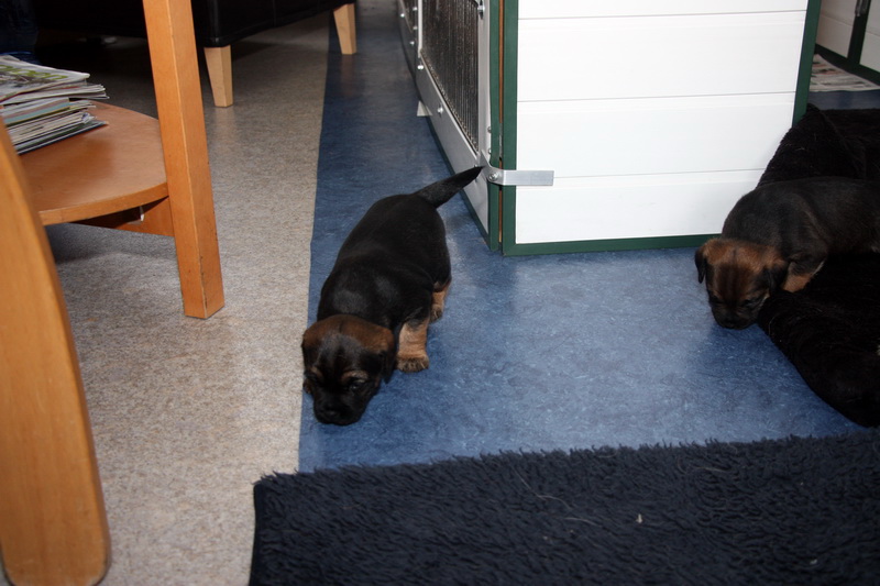De wereld is weer een stukje groter geworden voor de pups. Ze zijn voor het eerst de kamerkennel uit geweest. We hebben het deurtje open gezet en gekeken wat er gebeurde. Kenny kwam er als eerste uit, terwijl Davin en Kintra het vanuit de deuropening nog even aankeken. Maar als snel volgde Davin en daarna ook Kintra. Kenny is al wat verder weg geweest, de rest bleef toch maar in de buurt van de kamerkennel.