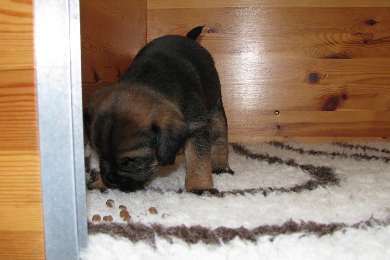 De pups moeten natuurlijk ook aan brokjes wennen. Vandaag wat brokjes in de kamerkennel gestrooid. Dat vonden ze wel heel interessant! Al gauw hadden ze door dat het eetbaar was en waren alle brokjes alweer verdwenen.