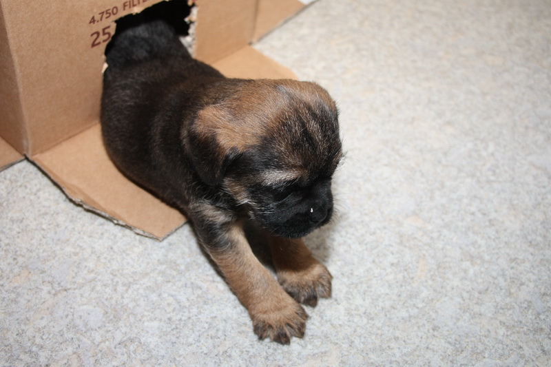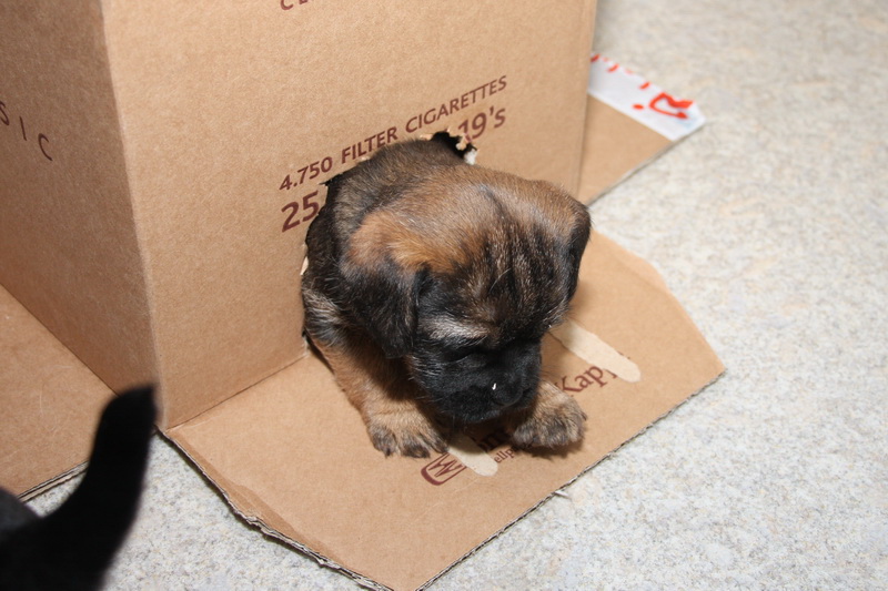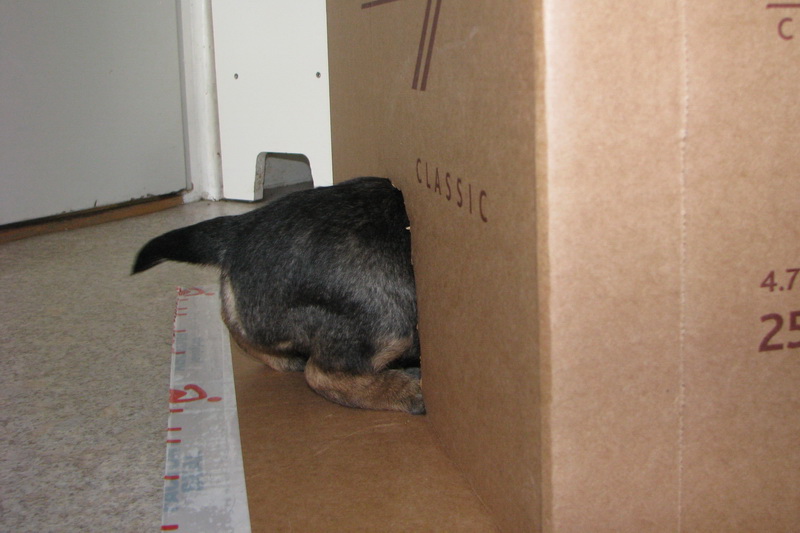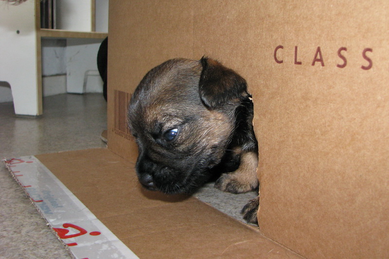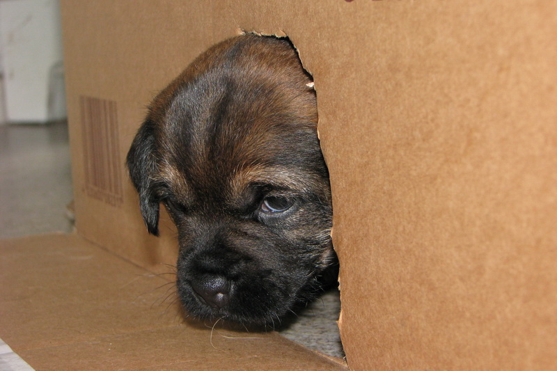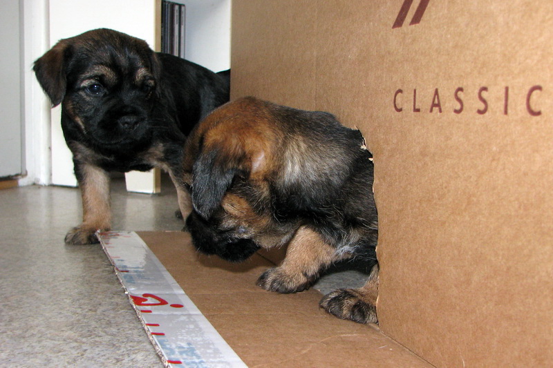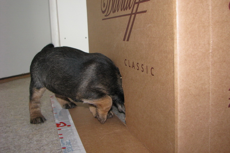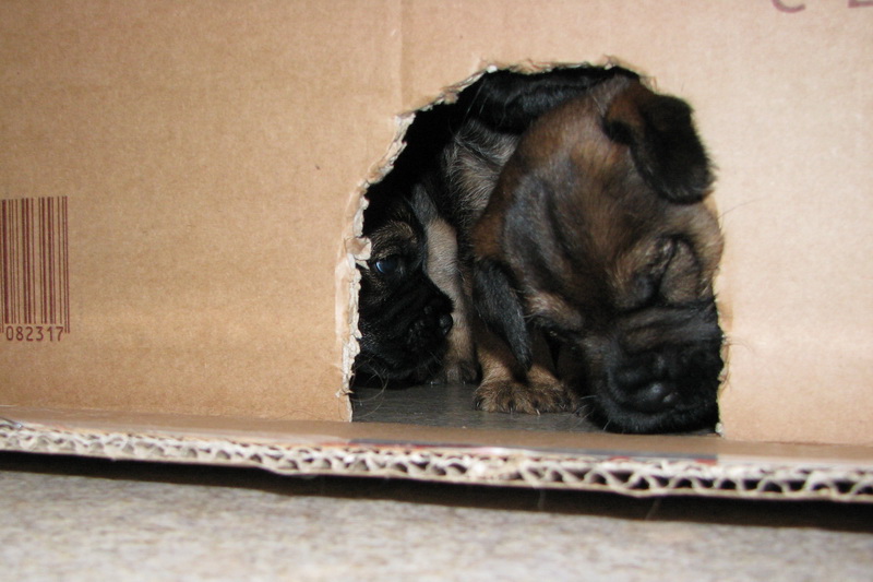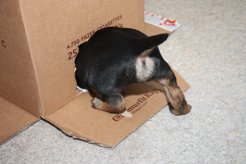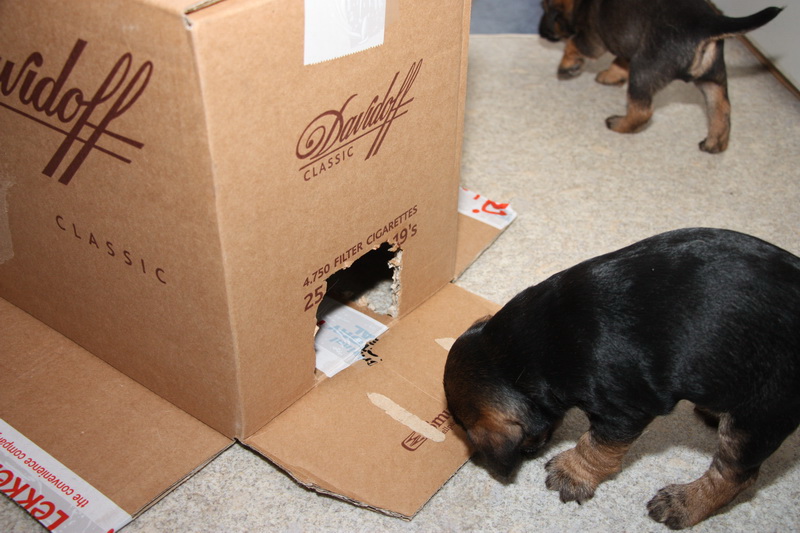 Een kartonnen doos met twee gaten, wat kunnen pups daar een lol mee hebben. In het begin verkennen ze voorzichtig de doos van buiten en dan krijgen ze al snel in de gaten dat je er ook in kunt. Het is wel even wurmen, want de gaten zijn niet al te groot (we hebben ze inmiddels al wat groter, de pups groeien immers door). In de doos is het heel spannend, het is donker en je hoort alles anders! Ook kan je van daaruit de anderen die nog buiten staan uitdagen. Of met z’n allen in de doos en daar lekker rotzooi trappen zonder dat moeder of oma er tussen komen.