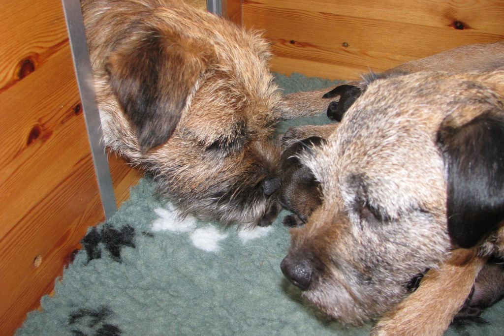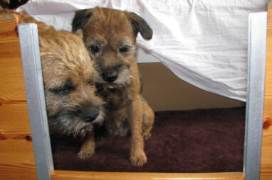 Fudge en Lewis zijn al, heel voorzichtig, bij de pups geweest. Alle twee vinden ze het heel interessant.