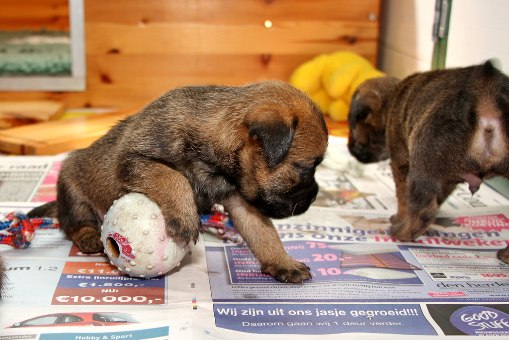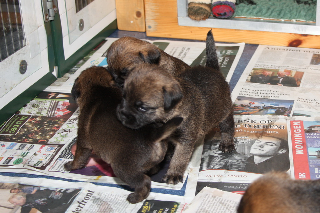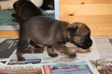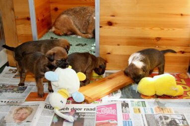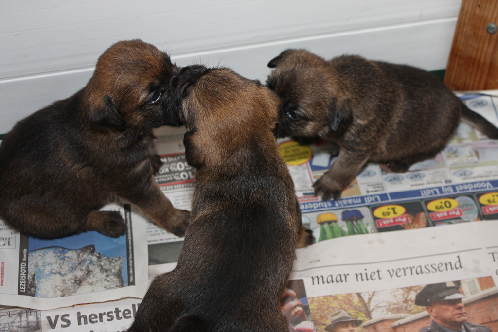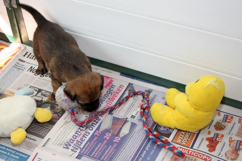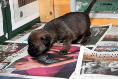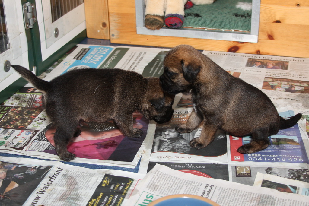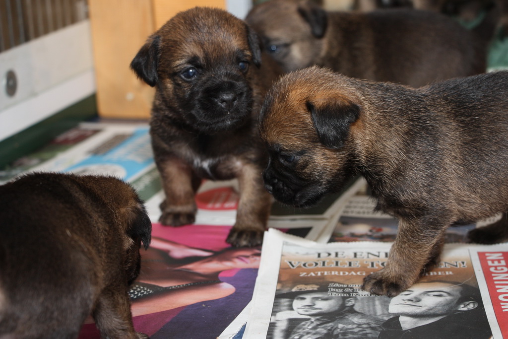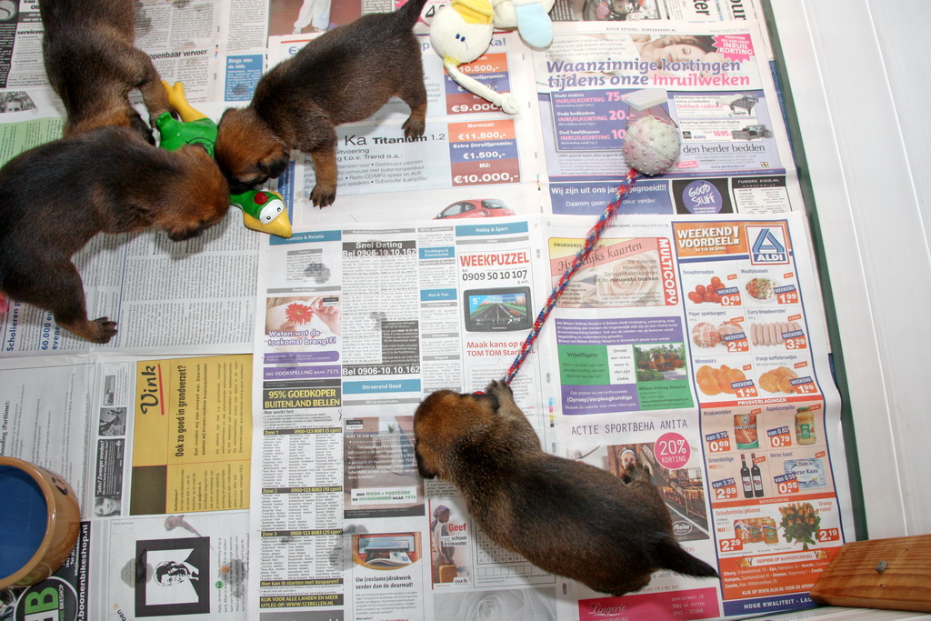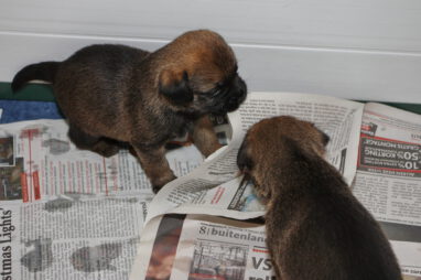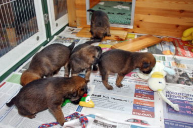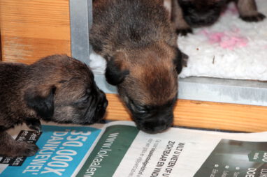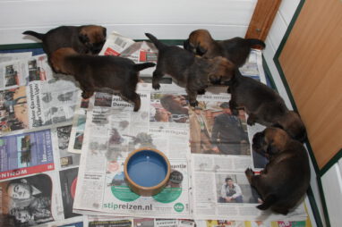 De pups mogen nu langer de kamerkennel in. Ze stappen heel voorzichtig uit de werpkist en hebben eerst alles eens goed verkend. Ze waren al in de kennel geweest, maar toen lag er nog een kleed in en zat er altijd iemand bij. Nu liggen er alleen kranten en hebben ze de kennel helemaal voor zichzelf.